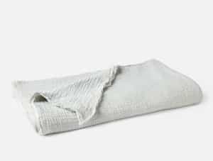 Organic cotton provides a soft, natural feel in a featherweight coverlet with a matelassé ripple texture for airy comfort. Waved edges with a secure fringe and a neat zigzag stitch give coastal style and a truly unique piece.