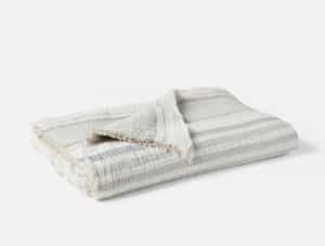 Topanga Matelasse Throw in Sea Stripe offers a light, airy layer with a ripple texture and wave-inspired edges, delivering featherweight drape that moves with the room. Lightweight comfort, soft texture, coastal-inspired detail, and versatile styling make it easy to layer on beds, sofas, or chairs, with a tiny zigzag stitch that keeps the fringe neatly in place.
