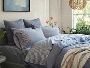 Breathable, lightweight comfort comes from the Organic Crinkled Percale Sheet Set in Indigo Stripe, crafted from 100% organic cotton for a cool touch that stays soft with every wash. The naturally crinkled texture adds casual style, while a durable, low-maintenance, GOTS-certified finish keeps skin-friendly bedding looking good over time.