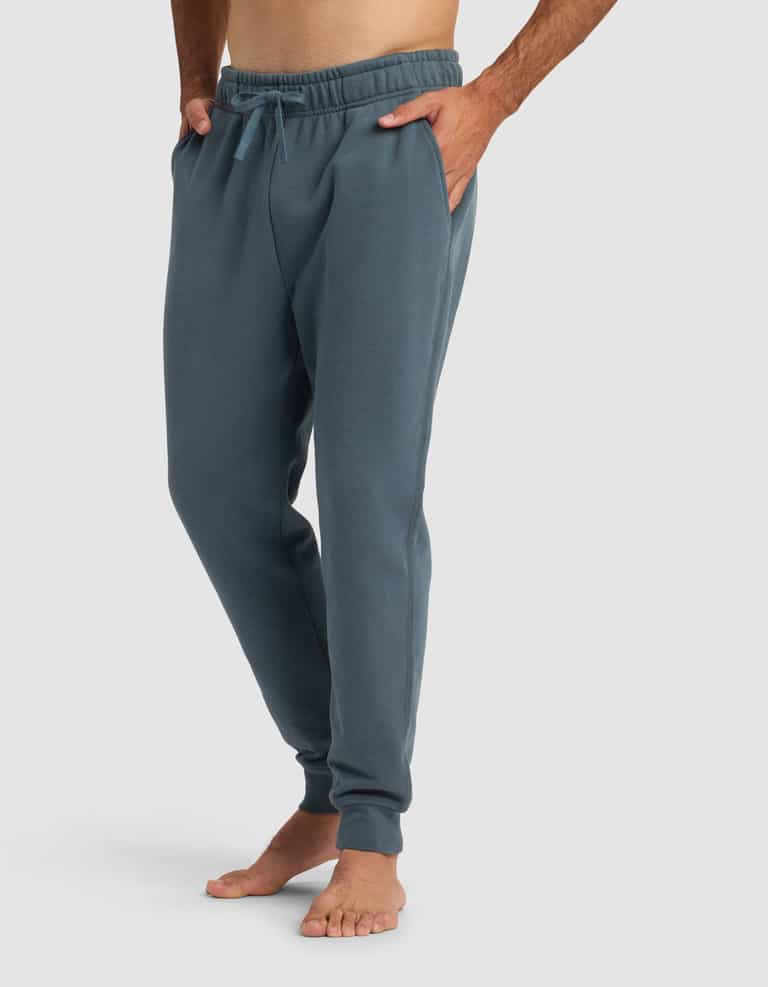 A person wearing Cozy Earth's Men's Everywhere Pant in navy, a gray tee, and white sneakers with gum soles stands hands-in-pockets against a light gray background. Only the lower body is shown. |Color:Eclipse
