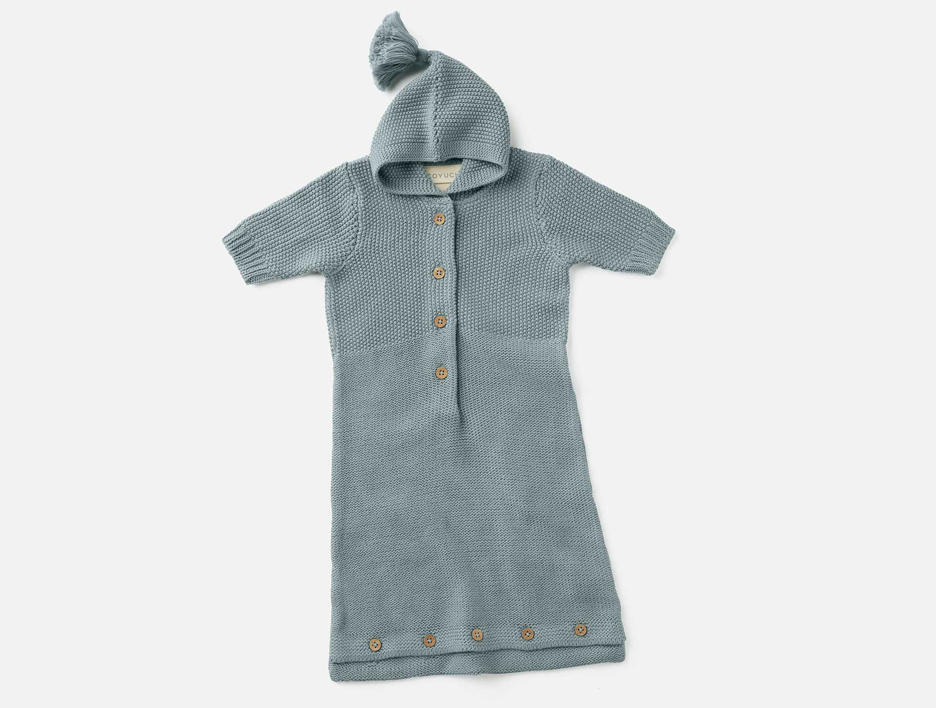 Experience the ultimate coziness with our organic cotton snuggle sack, featuring a delightful blend of reverse jersey and seed stitch for a unique look. Designed with easy access coconut shell buttons and a charming hood with a tassel, this soft and gentle sack keeps babies snug and makes for an ideal gift.