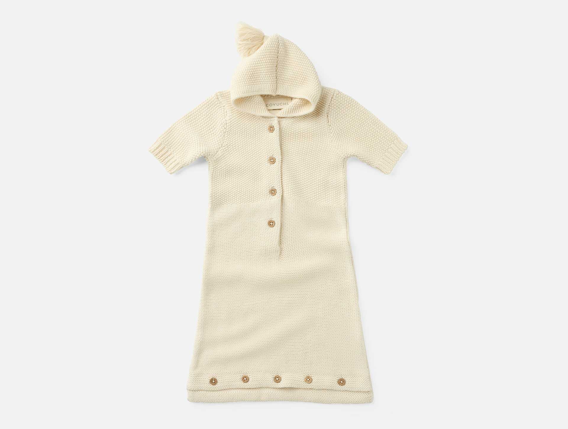 Arroyo Organic Knit Snuggle Sack is soft, cozy, and gentle against baby's skin, made from organic cotton with textured reverse jersey and seed stitch for a warm, inviting feel. A front placket with four coconut shell buttons and a bottom placket with five buttons make dressing and changing easy, while an attached hood with an oversized tassel adds warmth and charm, making it a natural organic baby gift option.