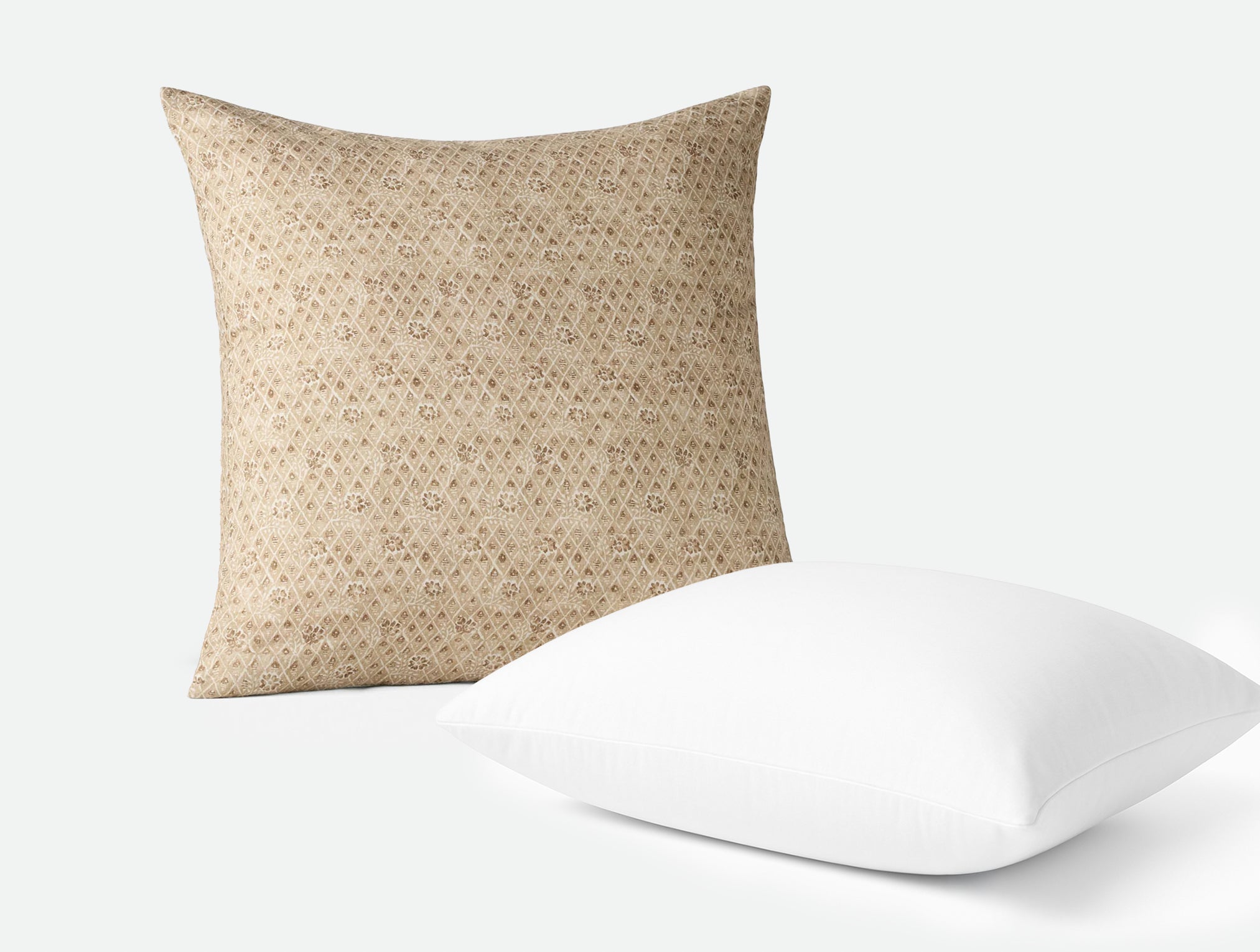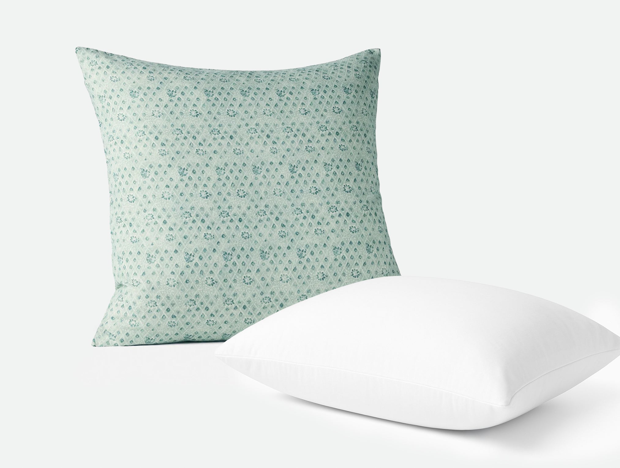 This Coral Bell Print Decorative Pillow Cover + Pillow Insert Set blends vintage charm with everyday comfort, featuring a geometric floral pattern inspired by an antique woodblock print on a soft, durable fabric blend. Includes a pillow insert for a complete set, with a 230-thread-count organic cotton shell that is down-proof, a fill of pure duck feathers and down, and an Indiana duck farm audited annually by a third party to ensure animal welfare.