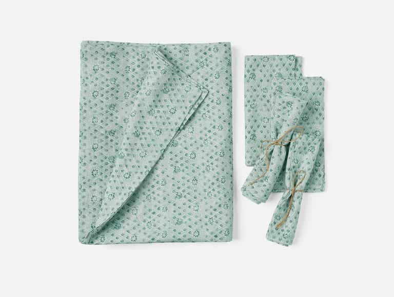 The Coral Bell Print Tablecloth + Napkin Set from Coyuchi adds nature’s beauty to the table with a vintage-inspired floral geometric print on a soft, durable blend of GOTS certified organic cotton and recycled linen. Sustainably crafted with high-quality details, it’s suitable for everyday use and special occasions alike.