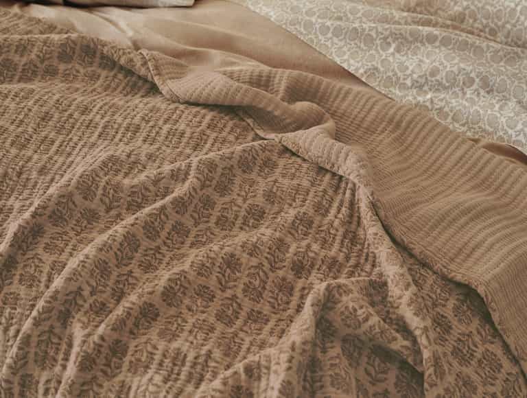 Mirada Organic Matelasse Coverlet blends a jacquard-woven matelasse texture with a reversible design, showing chrysanthemum print on one side and a solid color on the reverse. Made from 100% GOTS certified organic cotton, it is filled with yarn for natural breathability and garment washed for a soft, lived-in feel, making it a versatile coverlet or lightweight throw.
