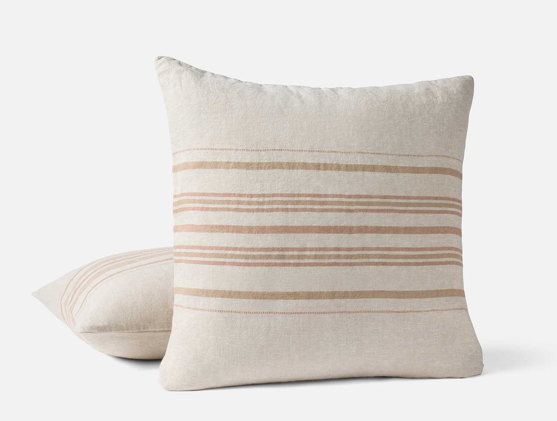 The Mojave Organic Linen Decorative Pillow Cover combines softness and eco-friendly luxury. With yarn-dyed neutral tones and interspersed dobby stripes, it adds earthy elegance and textured charm to any room, crafted from 100% GOTS certified organic linen for ultimate comfort.