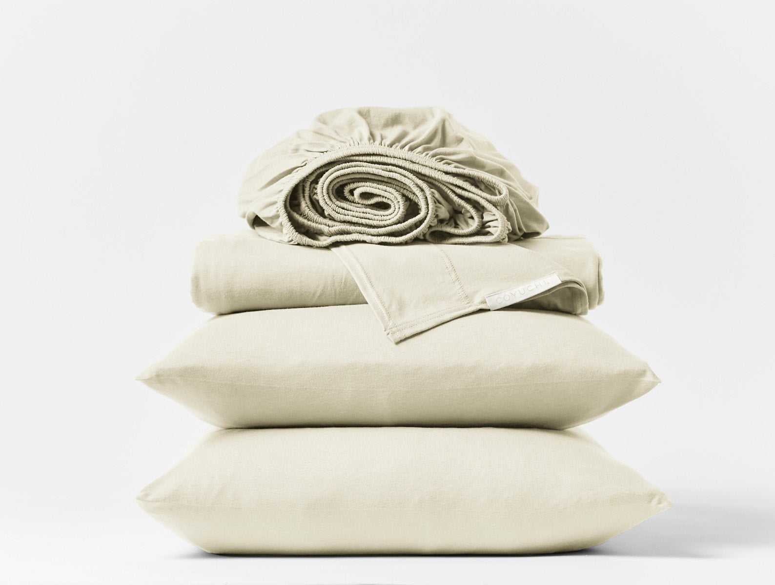 Organic Jersey Sheets offer a soft, breathable knit crafted from organic cotton for cozy, restful nights. A familiar, tee-like texture and a substantial yet airy weight deliver lasting comfort every night.