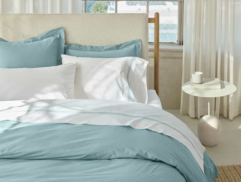 Experience a crisp, breathable sleep surface with the Coyuchi Refined Organic Percale Sheet Set featuring landscape embroidery stitched with premium matte German threads for a luxe, understated look. Made from organic percale, these sheets stay gentle on skin and provide cool comfort year round, delivering practical everyday ease in a calm, refined bedroom.