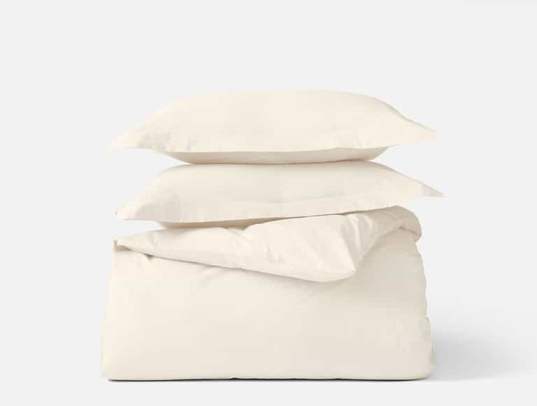 The Refined Organic Percale Duvet Set, formerly known as Refined Organic Percale, uses GOTS-certified 100% organic cotton in a tight percale weave for a cool, crisp feel. Designed for warm sleepers, it breathes to promote air circulation and offers durable construction with a lightweight, smooth touch for comfortable nights.