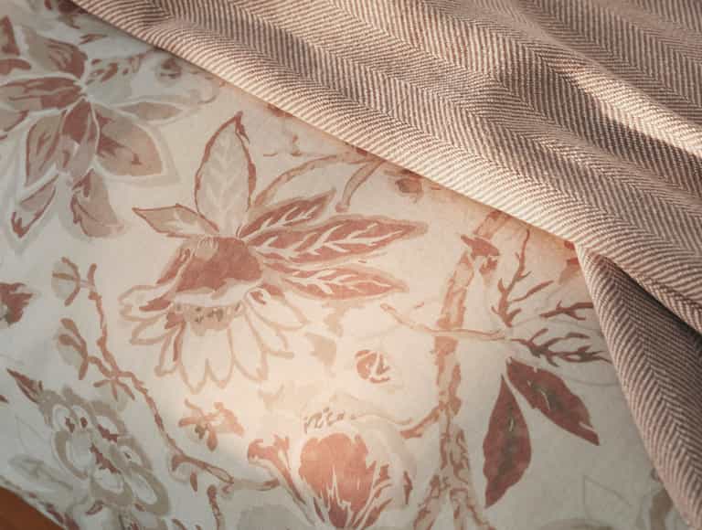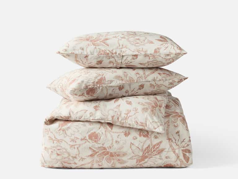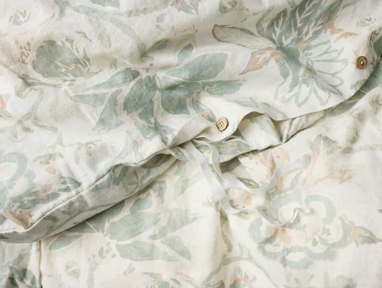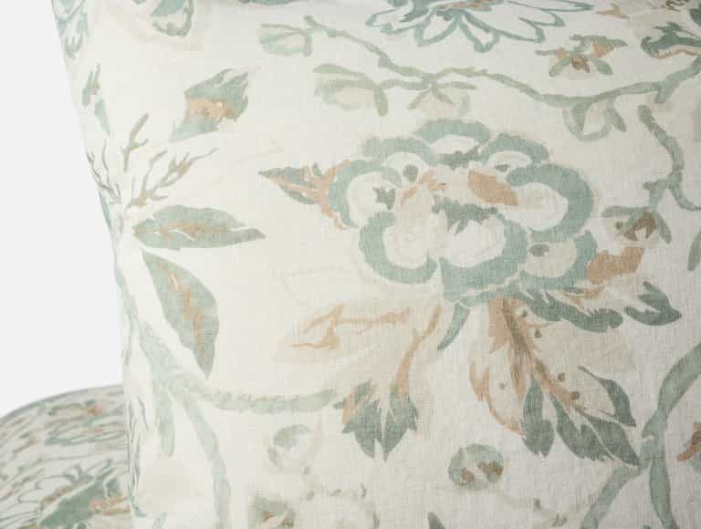 Linen and Organic Cotton Blend: Texture of linen with cotton softness. Portugal Craftsmanship: Made at an esteemed mill in Portugal. Antique Floral Design: Floral pattern in calming greens or earthy tones. Softens with Washes: Becomes softer over time. Coconut Shell Closures: Natural button closures. Eco-conscious Construction: Environmentally friendly materials and processes. Pairing Options: Complements Relaxed Organic Linen or cotton sheet collections.