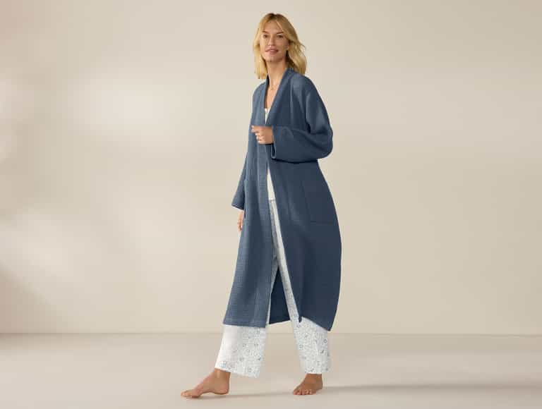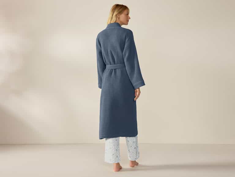 Designed for spa-like comfort at home, this robe combines natural fibers with practical details for everyday ease.