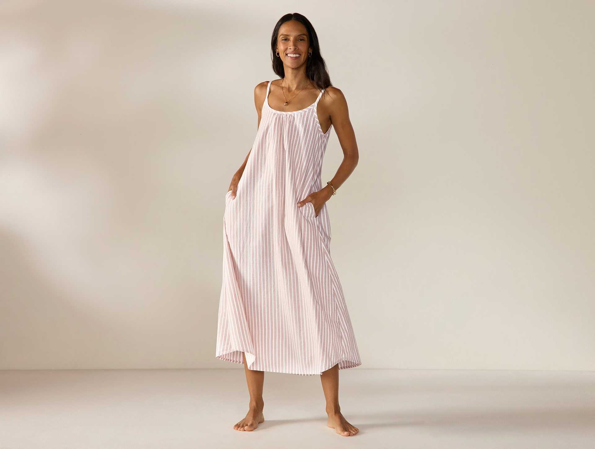This Isla Organic Cotton Night Dress + Cloud Loom Robe Set blends lightweight comfort with practical details, featuring 100% organic cotton percale for skin-friendly softness, a relaxed A-line silhouette, adjustable spaghetti straps, a low open back and hidden seam pockets. The Cloud Loom Robe uses long-staple cotton with the Aerospin process for a soft, smooth feel, and offers a shawl collar, an adjustable belt and side pockets for cozy, refined lounging.