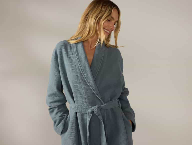 The Women’s Adriatic Organic Robe is crafted from 100% organic cotton, grown and woven in Turkey. It features a lightweight, relaxed weave that stays breathable and soft against the skin. A garment-dyed finish adds texture and subtle color variation, making each robe feel one-of-a-kind. The design offers a women’s fit with a gently tapered waist for a more tailored look.
