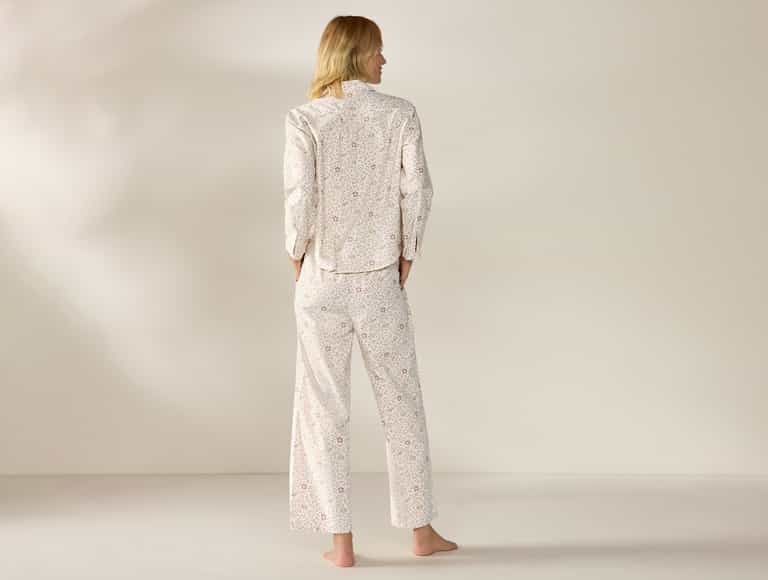 The Women’s Isla Organic Cotton Long-Sleeve Pajama Set is made from pure organic cotton. Gentle on the skin, breathable, and naturally hypoallergenic. Garment-washed poplin with a percale weave becomes softer over time. The top features two breast pockets, while the bottom has two front pockets and an elastic waistband for a comfortable fit.