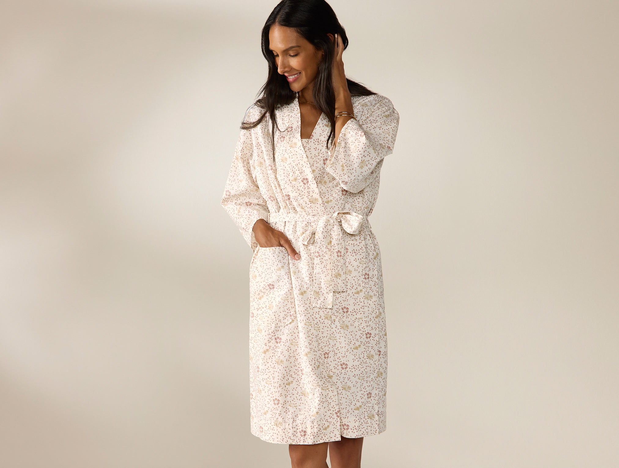 Indulge in the soft embrace of pure organic cotton while you sleep. Shades of Sage, Cypress, Gulf, Fawn, and Almond bloom into a colorful floral motif against a Soft White background. Printed on garment-washed poplin, this lightweight and breathable robe features a percale weave that only gets better with time.