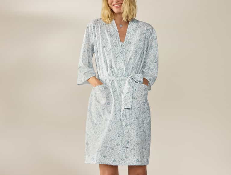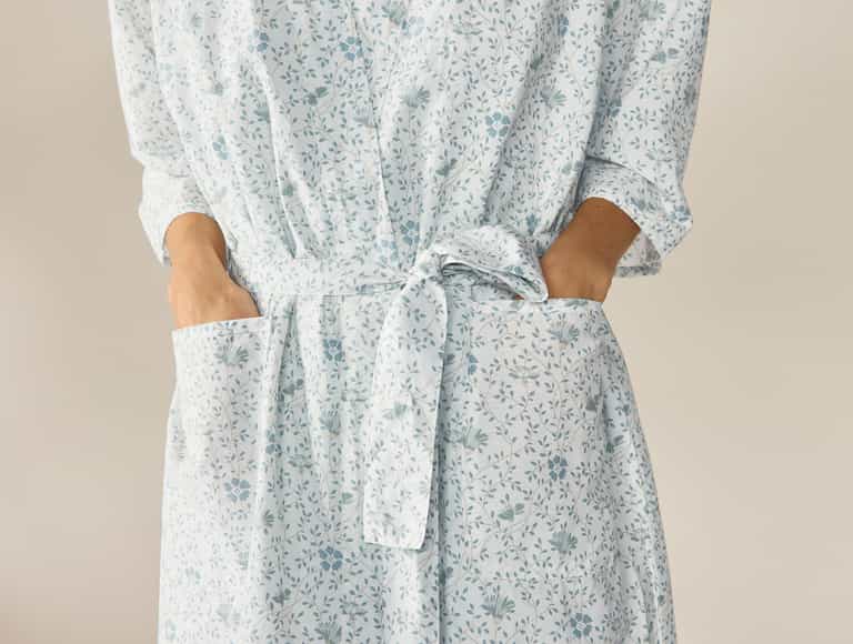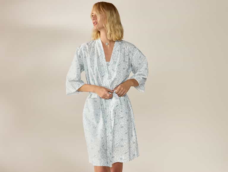Wrap up in the Women's Isla Organic Cotton Robe, crafted from luxurious organic cotton with an exquisite floral design on a soft white background. Its breathable poplin fabric, complete with a flattering relaxed fit, rounded patch pockets, and adjustable self-belt, provides effortless elegance and comfort for any routine.
