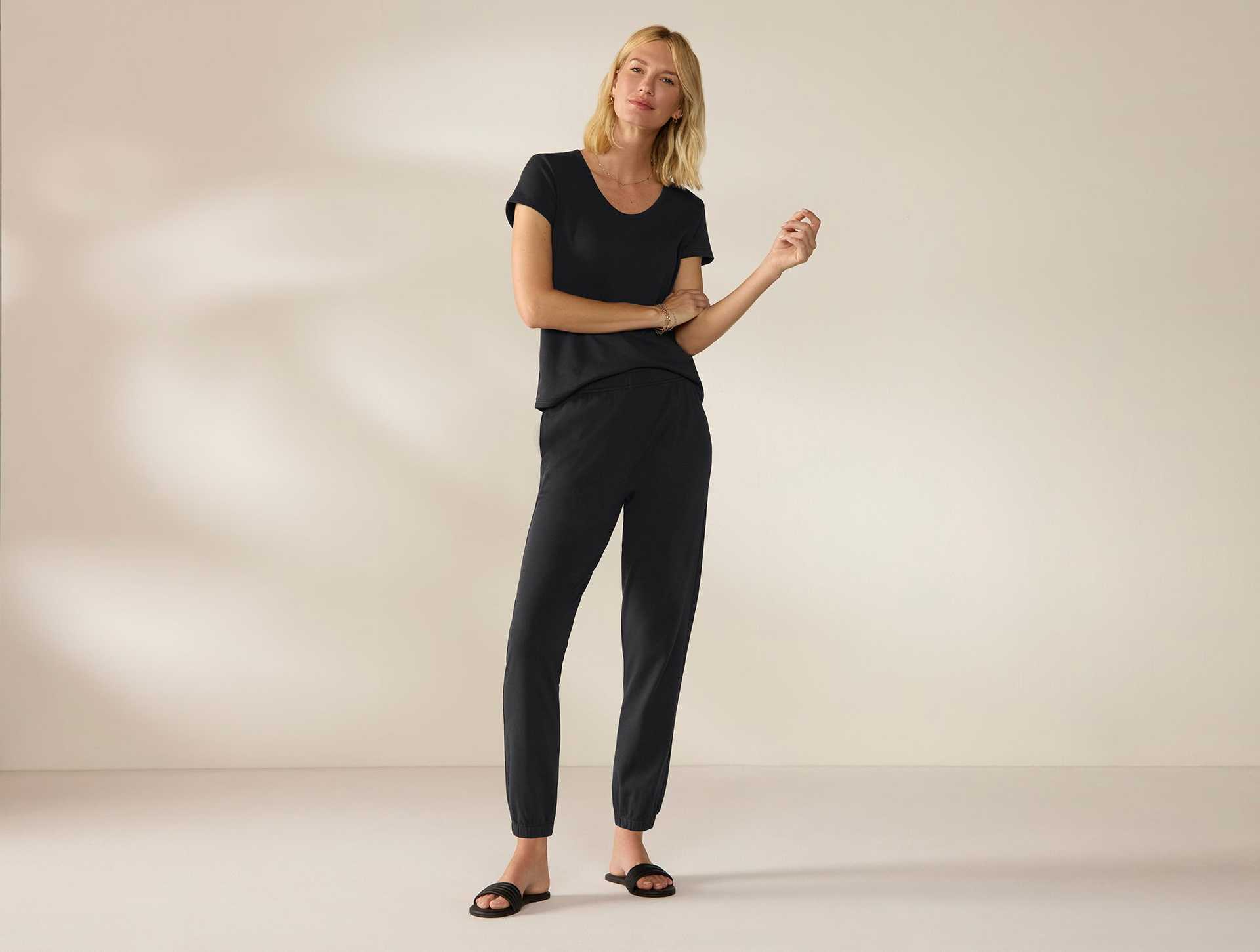 Soft enough to lounge in, classic enough for everyday wear. The Women’s Pima Organic Knit Jogger + Tee Set combines comfort and style in a two-piece, relaxed-fit look.