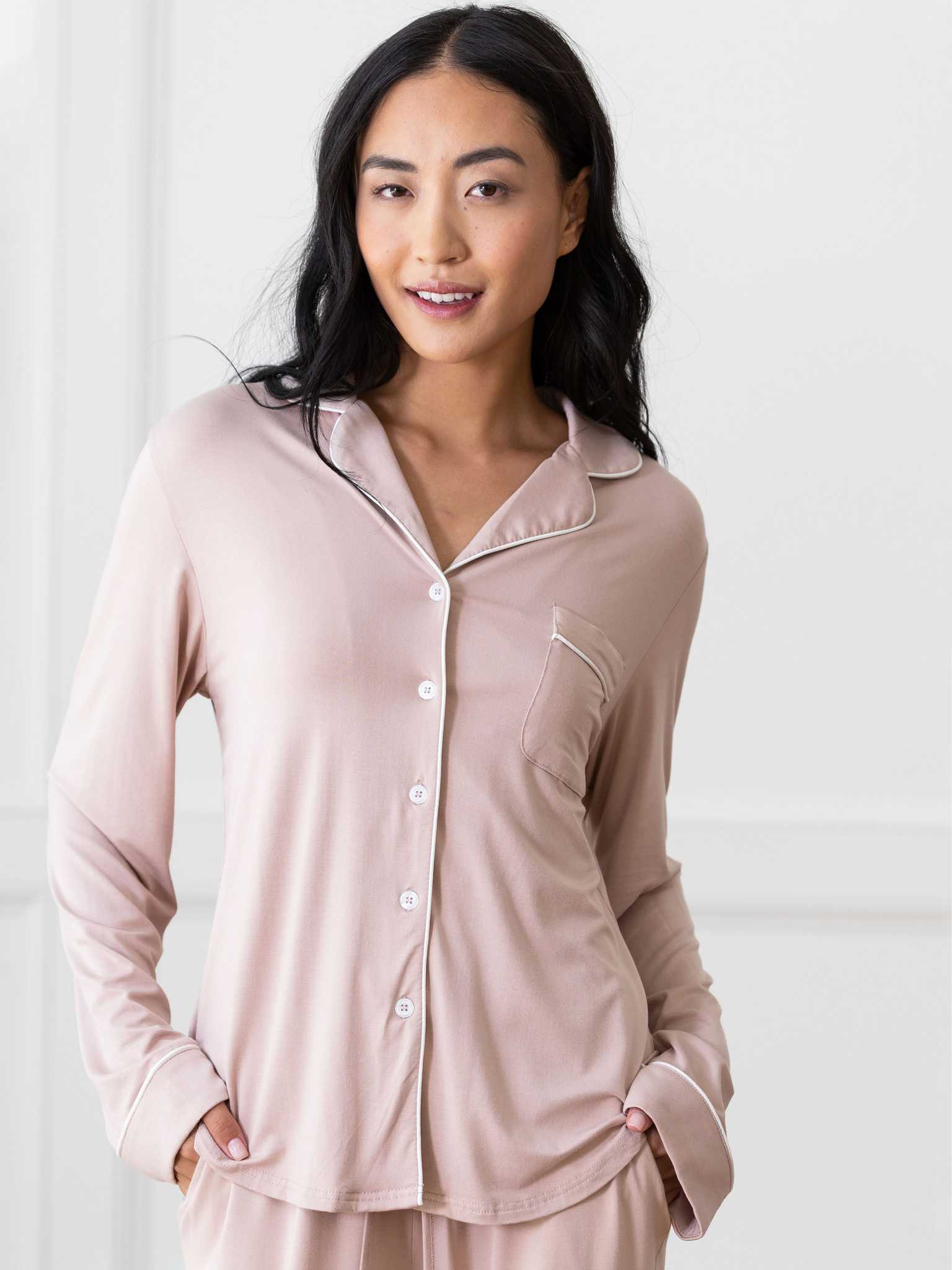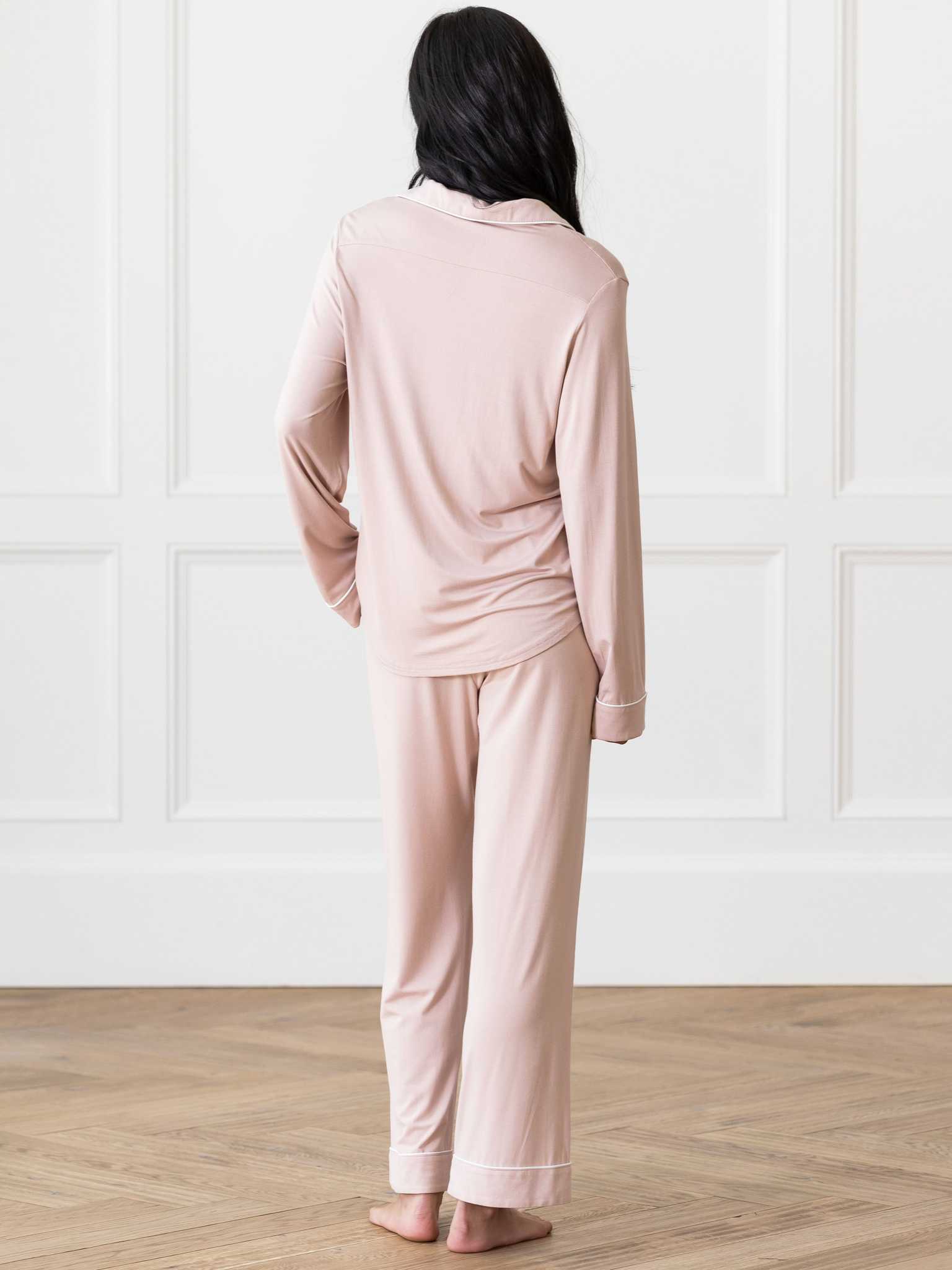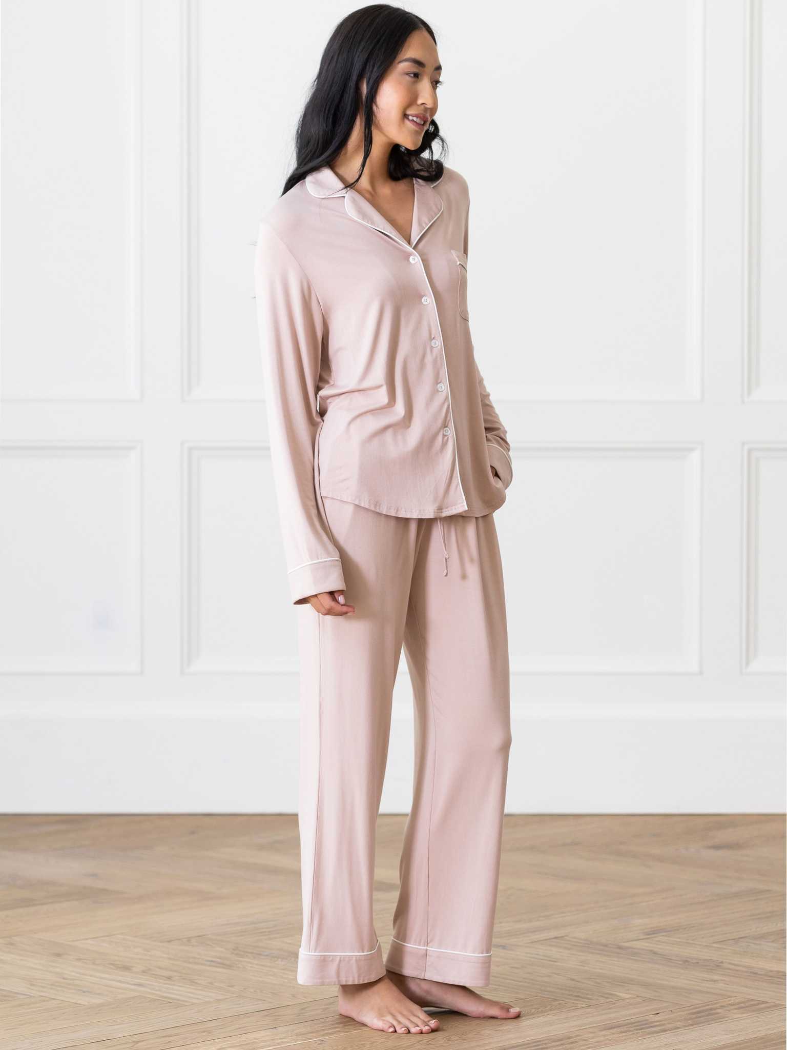 The Women’s Bamboo Stretch-Knit Long Sleeve Pajama Set PETITE — Last Chance — is a soft, breathable sleep set designed for a petite fit. Crafted from bamboo stretch-knit, this lightweight set drapes smoothly and sleeps cooler than cotton. Contrast piping runs through the top and pants, which include a pocketed button-up and pants with an elastic waistband.