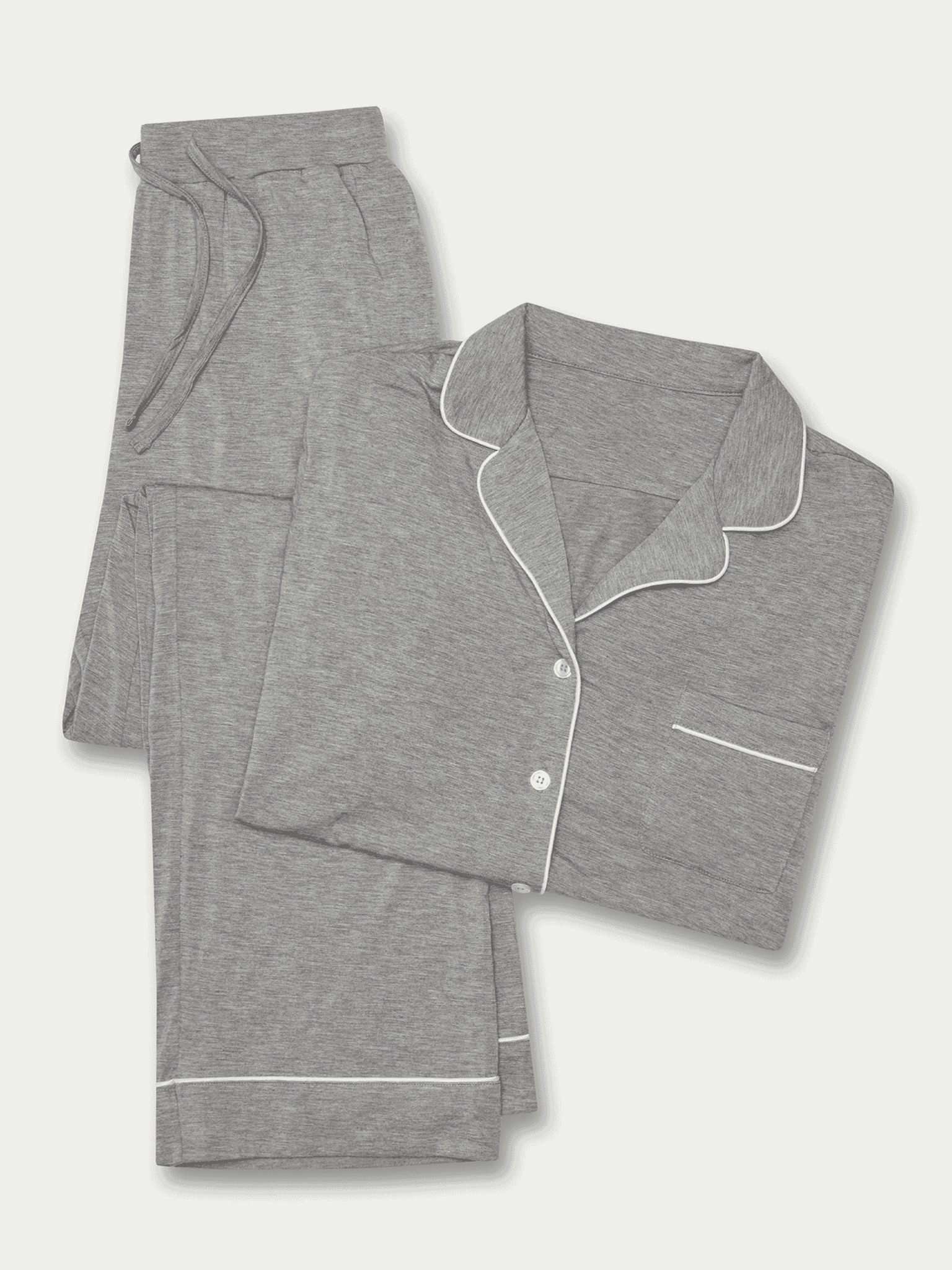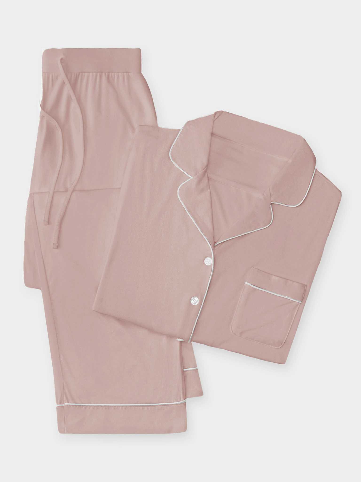 Soft, breathable bamboo stretch-knit fabric delivers a cool, lightweight feel that drapes smoothly for all-night comfort. The top features contrast piping and a pocketed button-front, while the pants have an elastic waistband for easy, everyday wear.