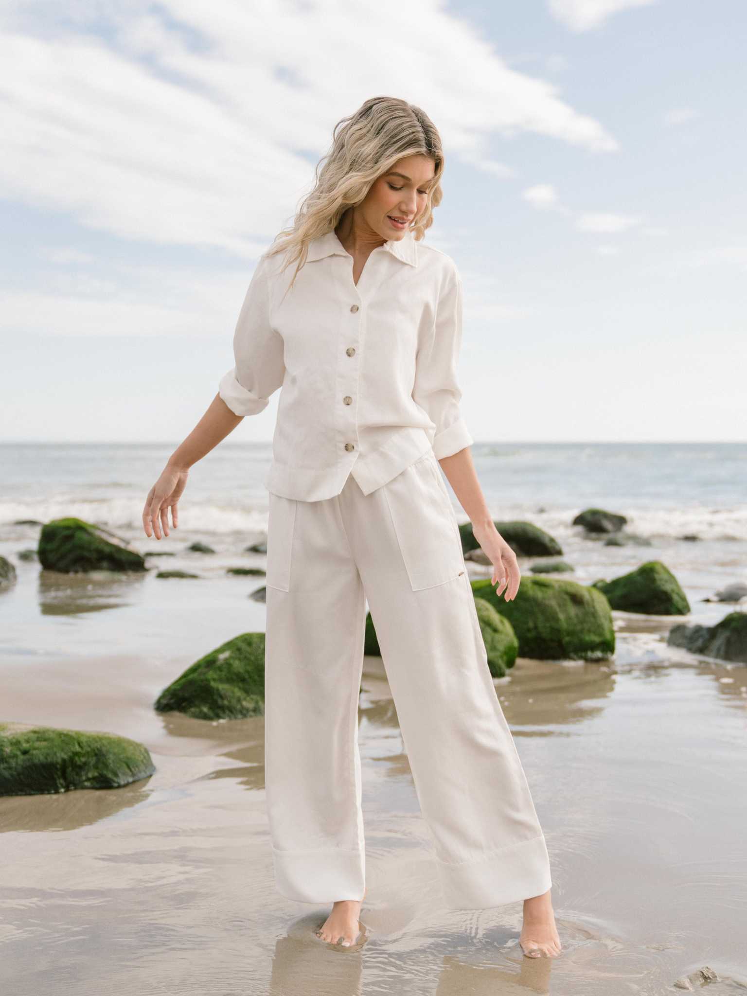 Relaxed pull-on pants in an 88% Tencel and 12% linen blend offer light, breathable comfort for warm days. The relaxed silhouette includes side patch pockets and a recycled PET logo charm, making it easy to pair with Coastal Comfort tops for a breezy, coordinated look.