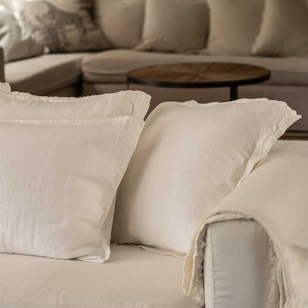 The Cushion Adele is crafted from elegant heavy decorative linen, bringing natural sophistication to your space, while its plush feather filling ensures comfort. With an easy-to-use envelope closure and decorative border flaps, this cushion is perfect for enhancing the style and coziness of any sofa, bed, or chair.