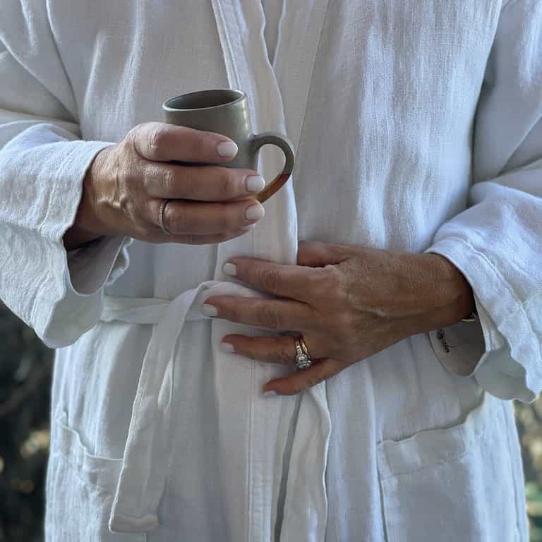 Start your day with style in the comfort of this 100% linen robe. This heavyweight robe, in a natural color, provides a perfect blend of elegance and ease for those morning moments.