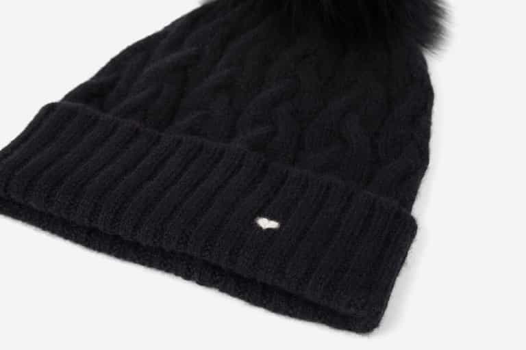 The Braid Beanie in Black offers effortless style with its soft cashmere braid knit and luxurious feel. Hand-made by skilled artisans, it features a removable fox fur pom-pom for a playful twist and an adjustable cuffed hem for a perfect fit, making it the ultimate chic accessory for chilly days.