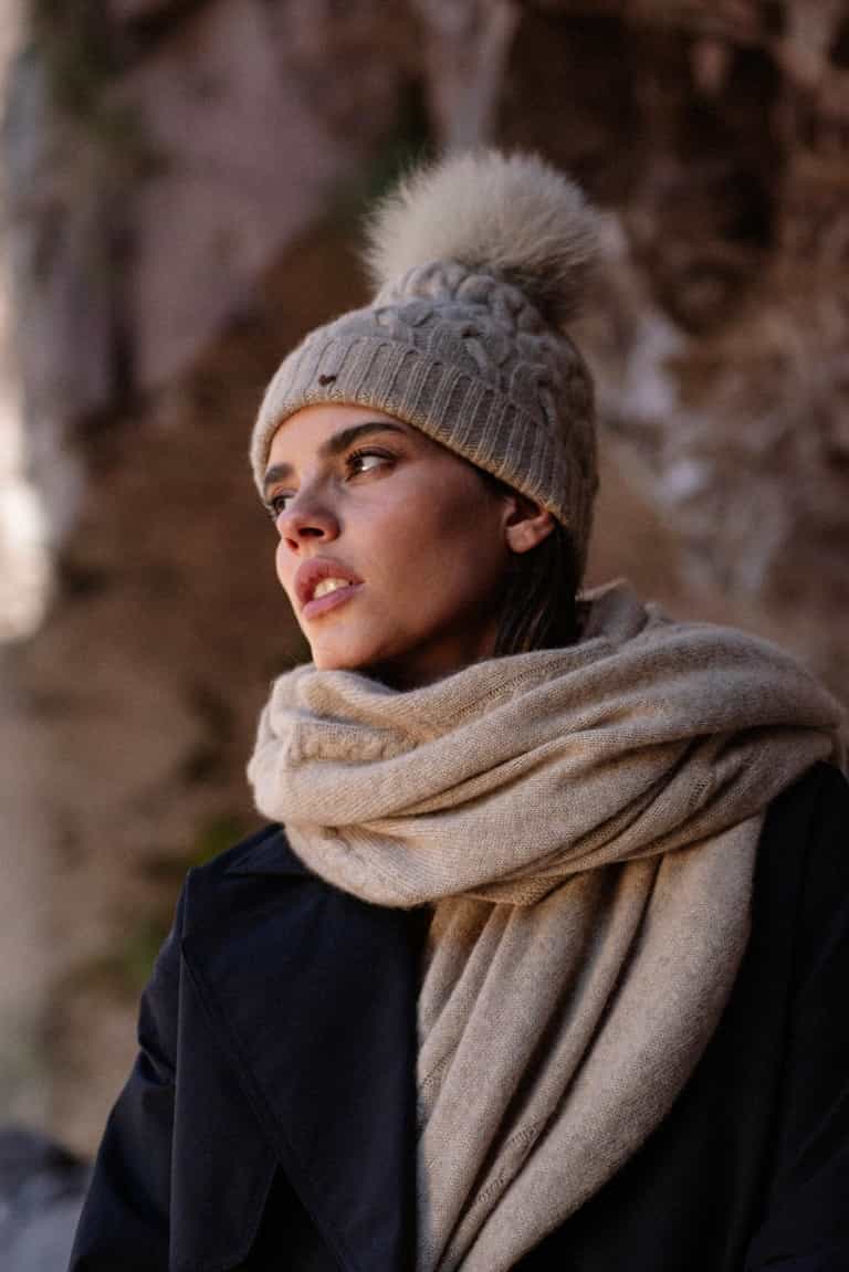 The Braid Beanie in Taupe delivers an effortlessly chic, feminine look with soft cashmere.