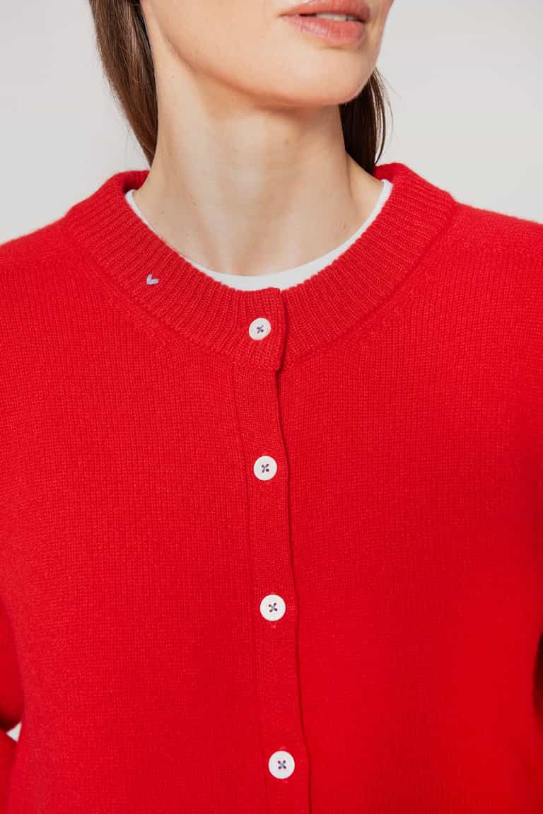 The Button Cardigan - Rouge is a 100% cashmere cardigan in a rich Rouge color, with clean lines and a cloud-soft knit for easy layering. Hand-finished with a heart stitch and a seamless knit for smooth comfort, plus signature contrasting buttons for a subtle pop and versatile styling.