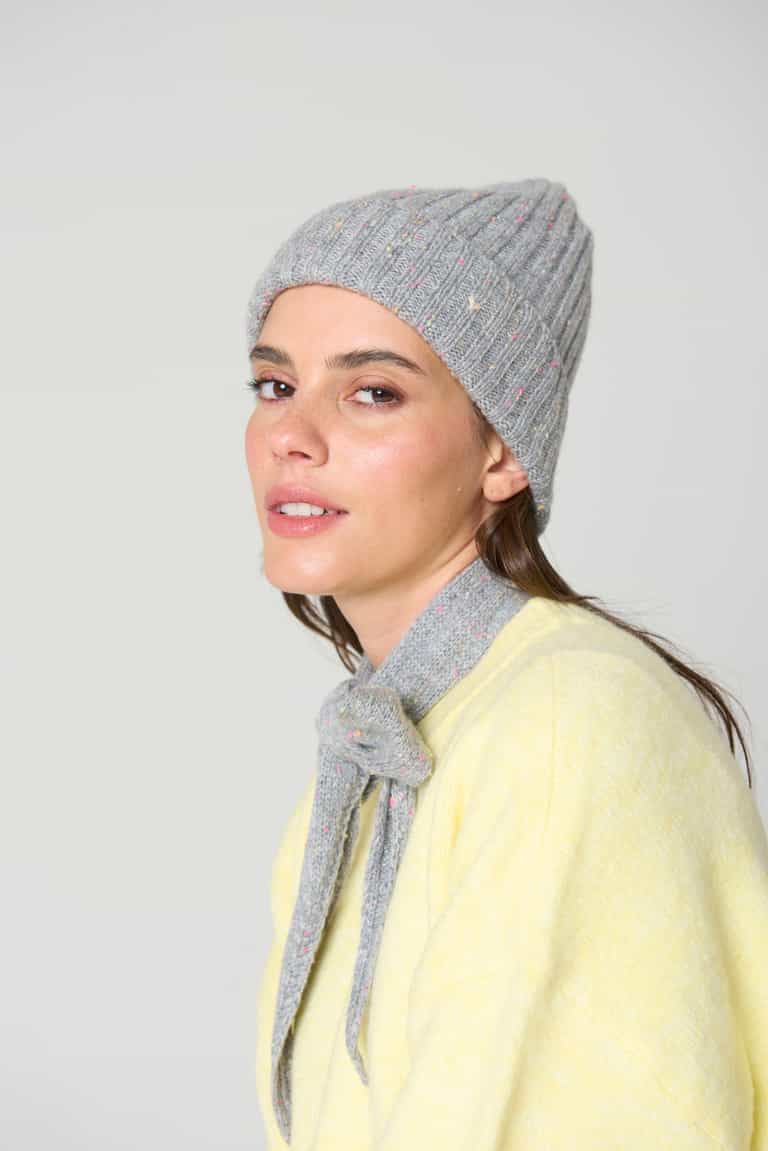 The Rib Beanie in Grey Confetti offers a clean rib knit and soft cashmere for everyday wear. This versatile piece blends a refined texture with warmth and ease.