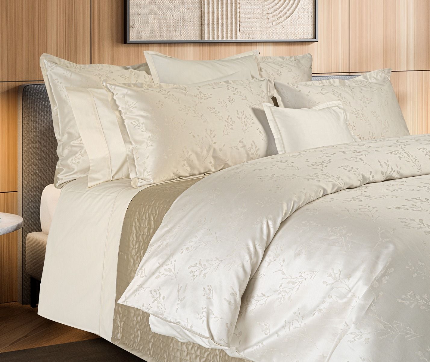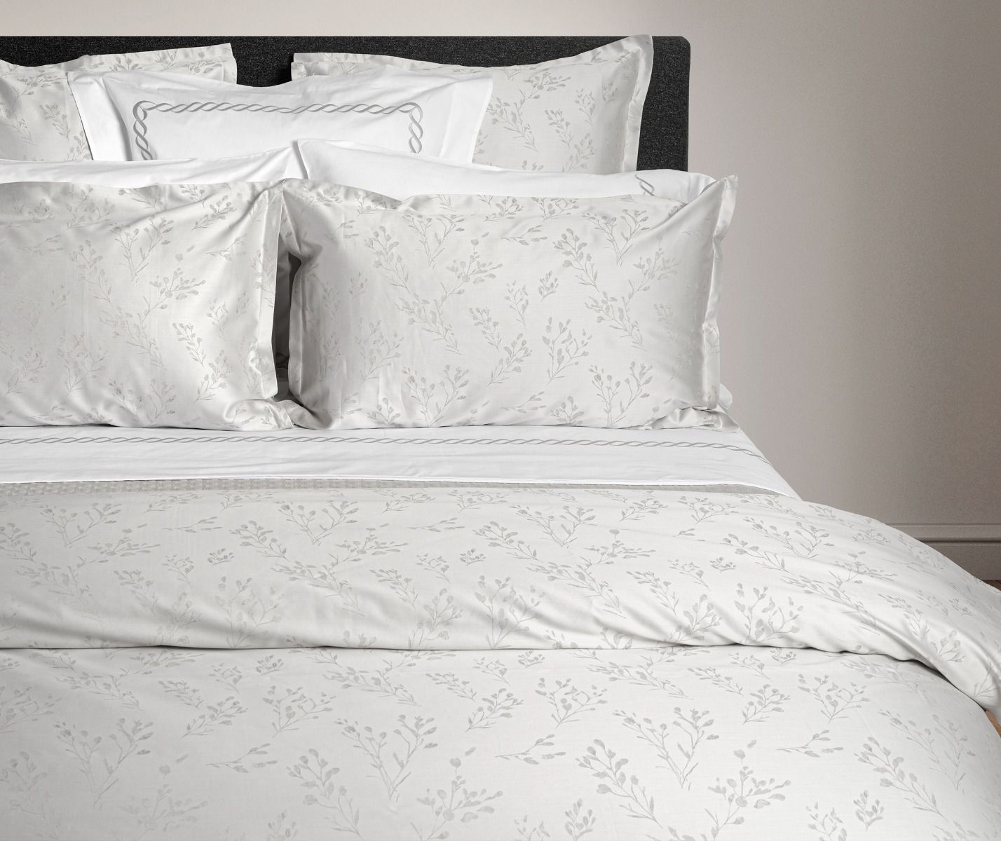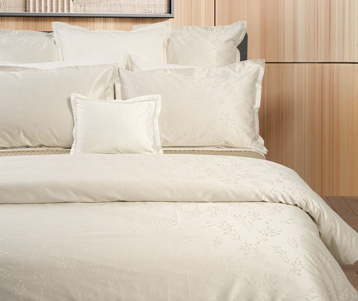 Nature-inspired Maremma Duvet Cover blends jacquard texture with 100% cotton for lasting comfort, finished with a silky sateen backing, a clean hem, button closure, and interior ties for secure daily use. Timeless and refined, it pairs with a range of bedroom styles to bring quiet luxury to the bed.