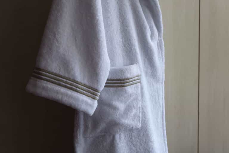 The Platinum Bathrobe brings hotel luxury at home with soft, durable 100% long-staple combed cotton and a cozy shawl collar. Three lines of embroidery on the cuffs and pockets add a refined touch, while two patch pockets offer convenient storage, made in Italy.