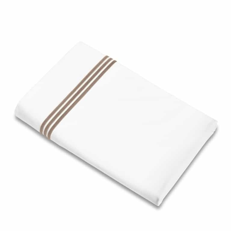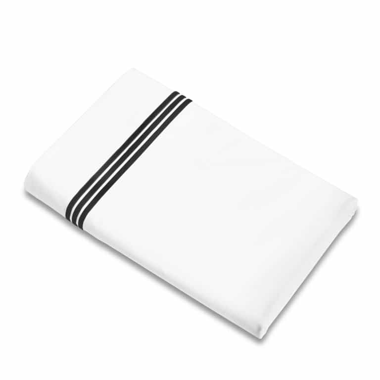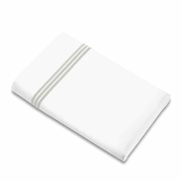 The Platinum Flat Sheet blends 100% long-staple cotton percale for a crisp, breathable feel and features three embroidered lines for a refined touch. Made in Italy, it offers a timeless look that pairs with many bedding styles and is in stock now.