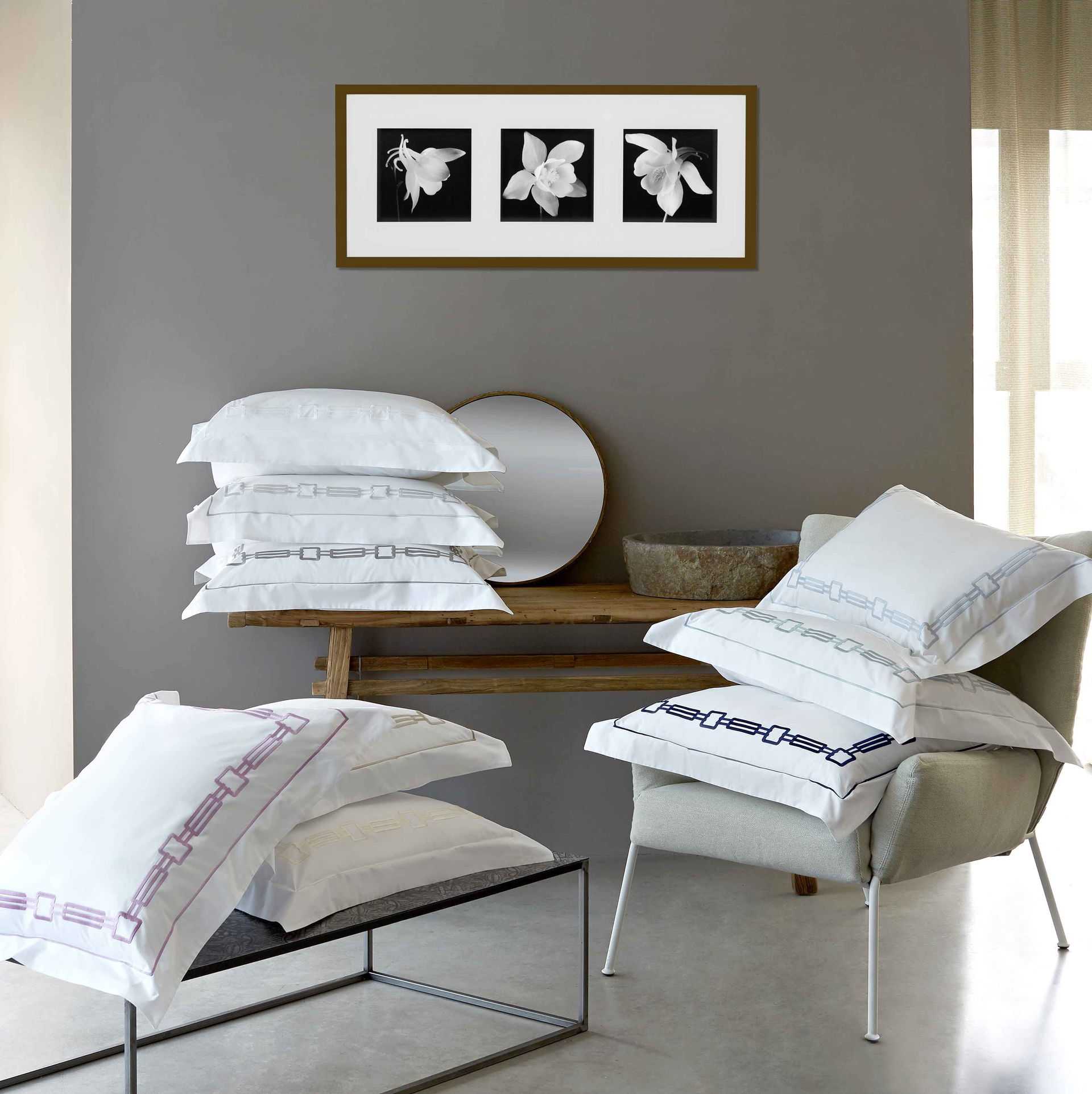 The Retrò Sham features a refined embroidery on a crisp white cotton percale base. Made in Italy, it uses 100% SUPIMA® extra-long-staple cotton with a 600 thread count for a smooth, breathable feel.