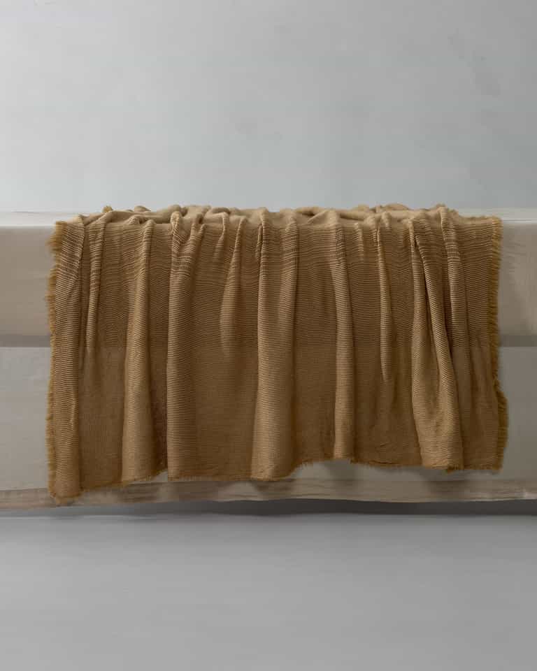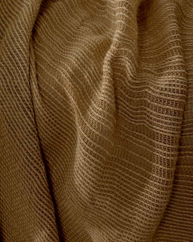 The BHAS throw blends wool (75%) and alpaca (25%) for warmth and softness, with a thick wave motif and a leno weave that creates an open, cozy texture, finished in garment-dyed tones for rich, nuanced color. Weighing 400 g/m², this decorative throw adds warmth and texture to any living space from Society Limonta.