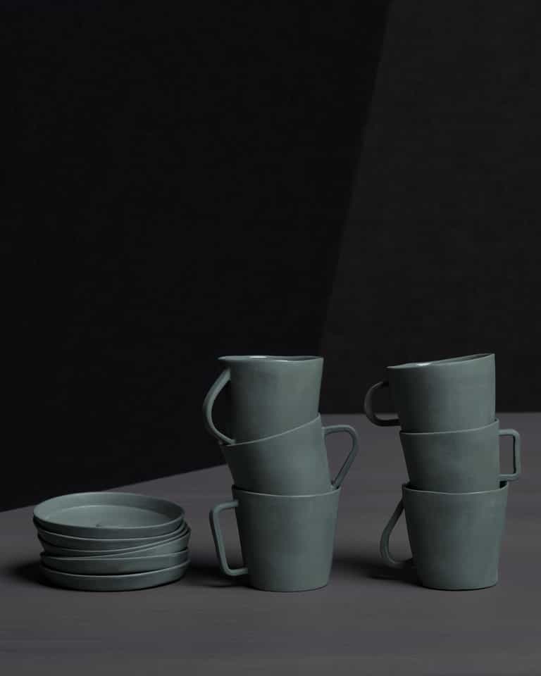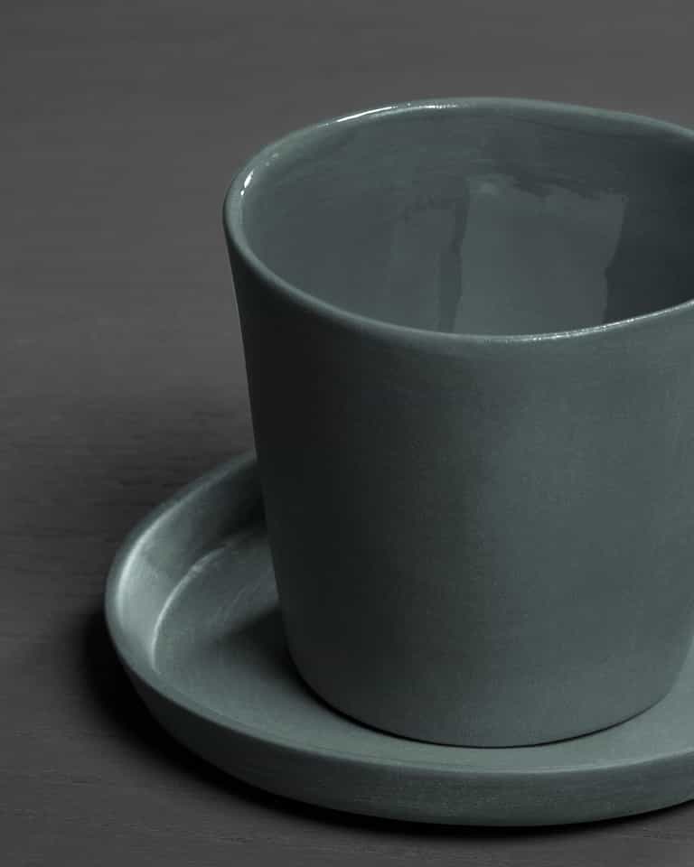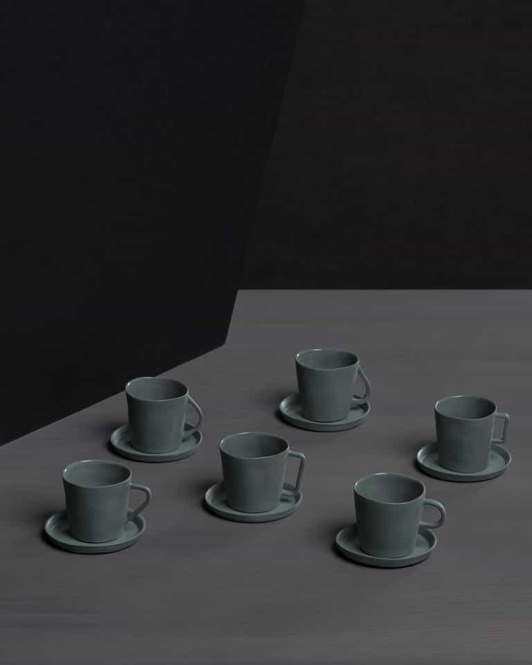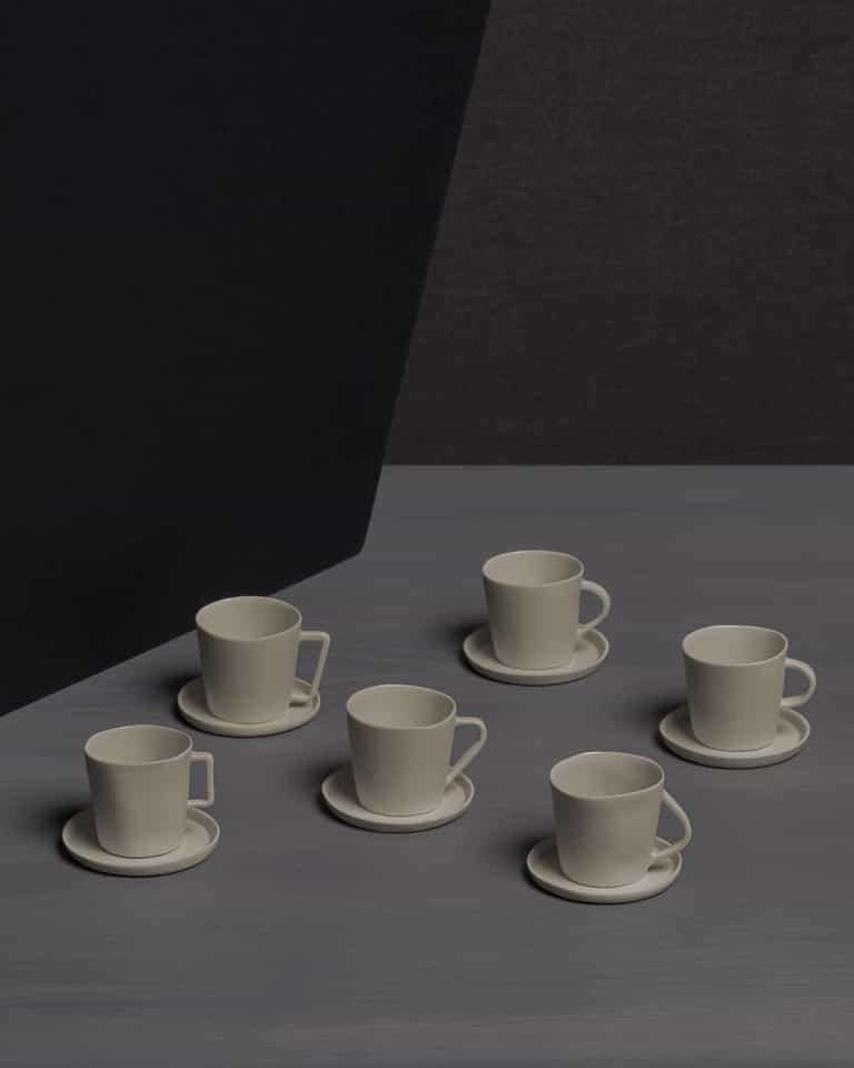 The Buto Espresso Cups set includes 6 espresso cups with saucers, featuring a glossy finish on the inside and a matte finish on the outside.