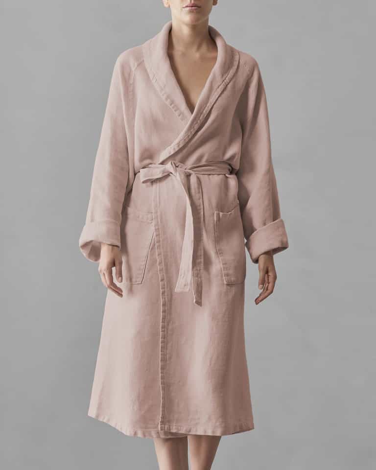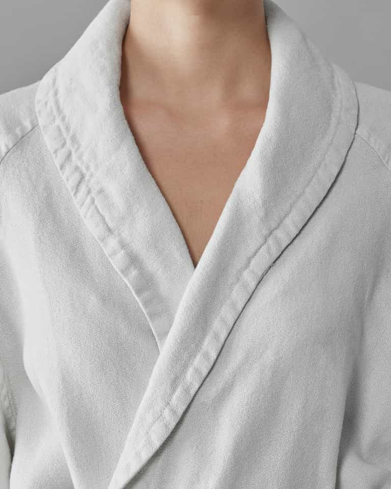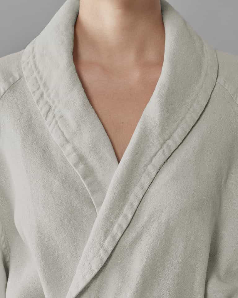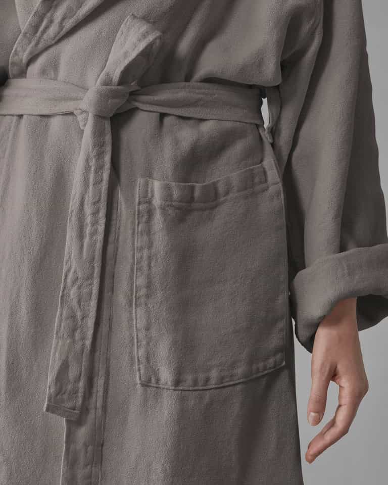 The Crel Bathrobe blends traditional linen with a fresh, soft feel and high absorbency. Made from crepe-effect linen, it features a shawl collar and two pockets. The garment-dyed finish gives each color a unique look, with a palette that ranges from neutral to seasonal tones. It is machine washable for easy care.