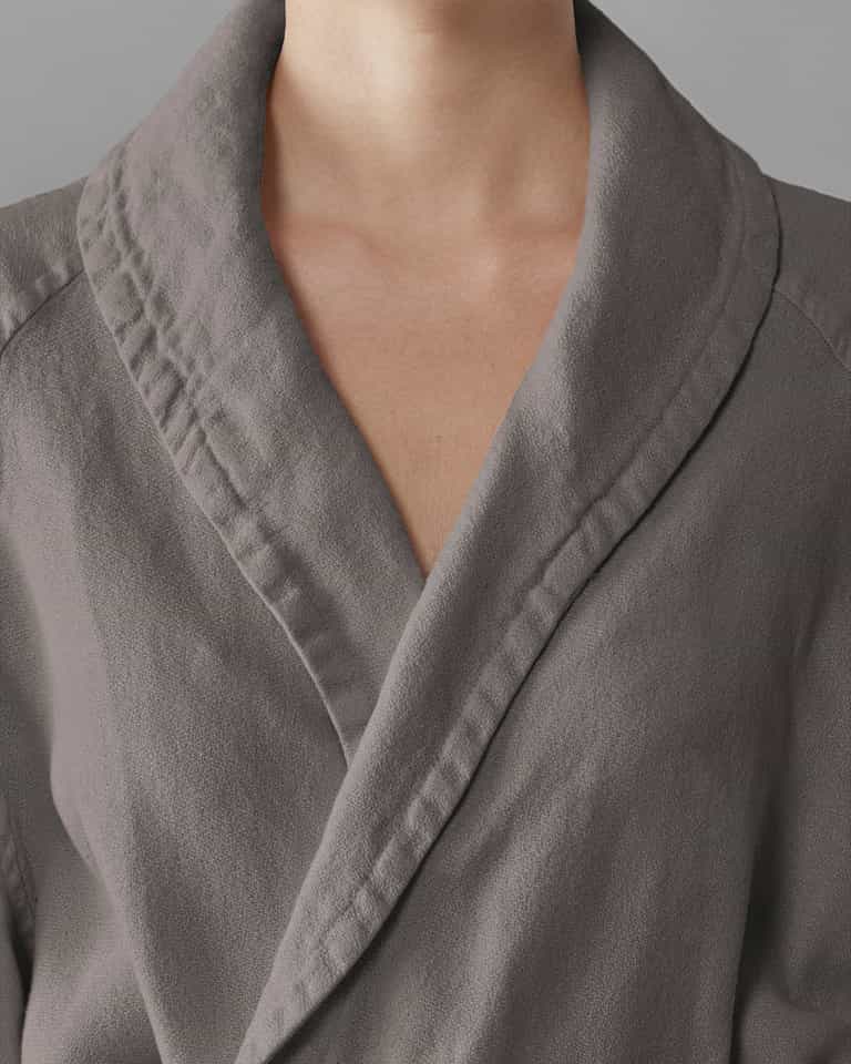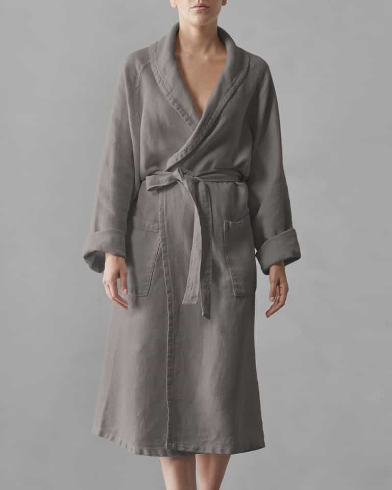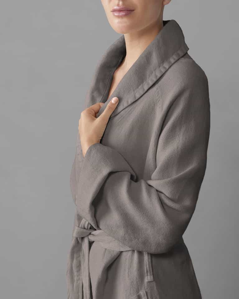 The Crel Bathrobe blends crepe-textured linen for a soft, breathable feel, with a shawl collar and two pockets for everyday comfort. Garment-dyed for unique depth and color, this elegant robe is machine washable for easy care and keeps a timeless look in any bathroom.