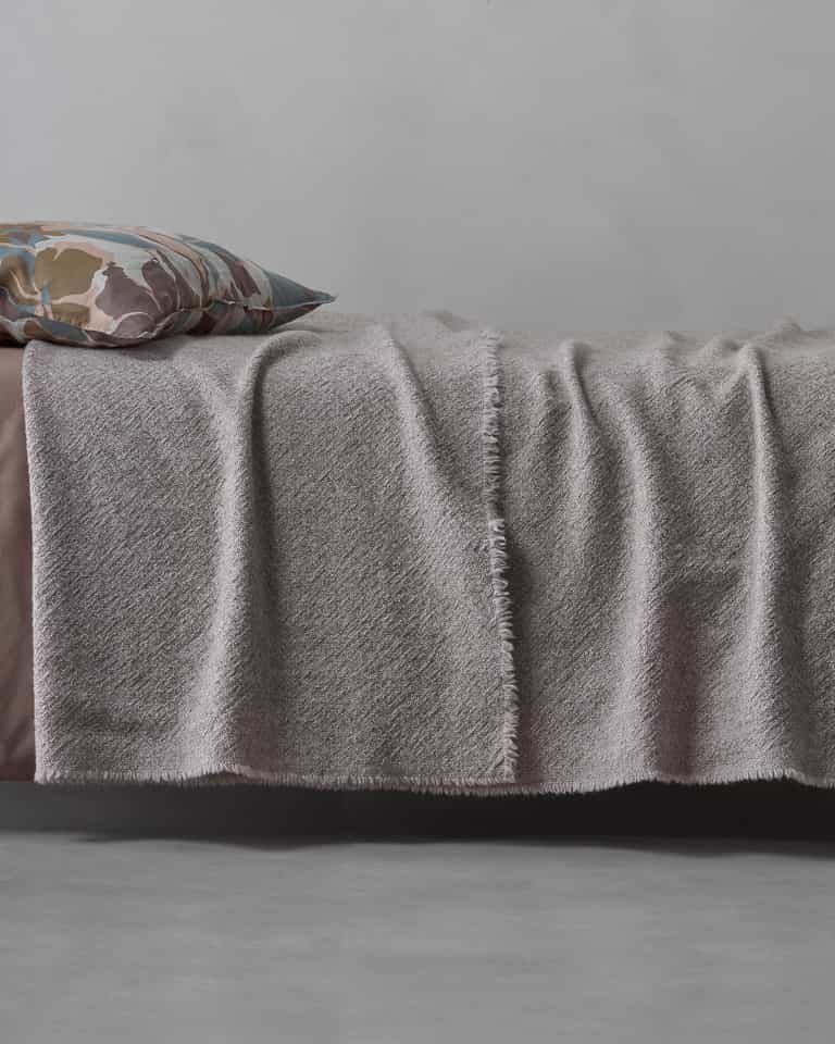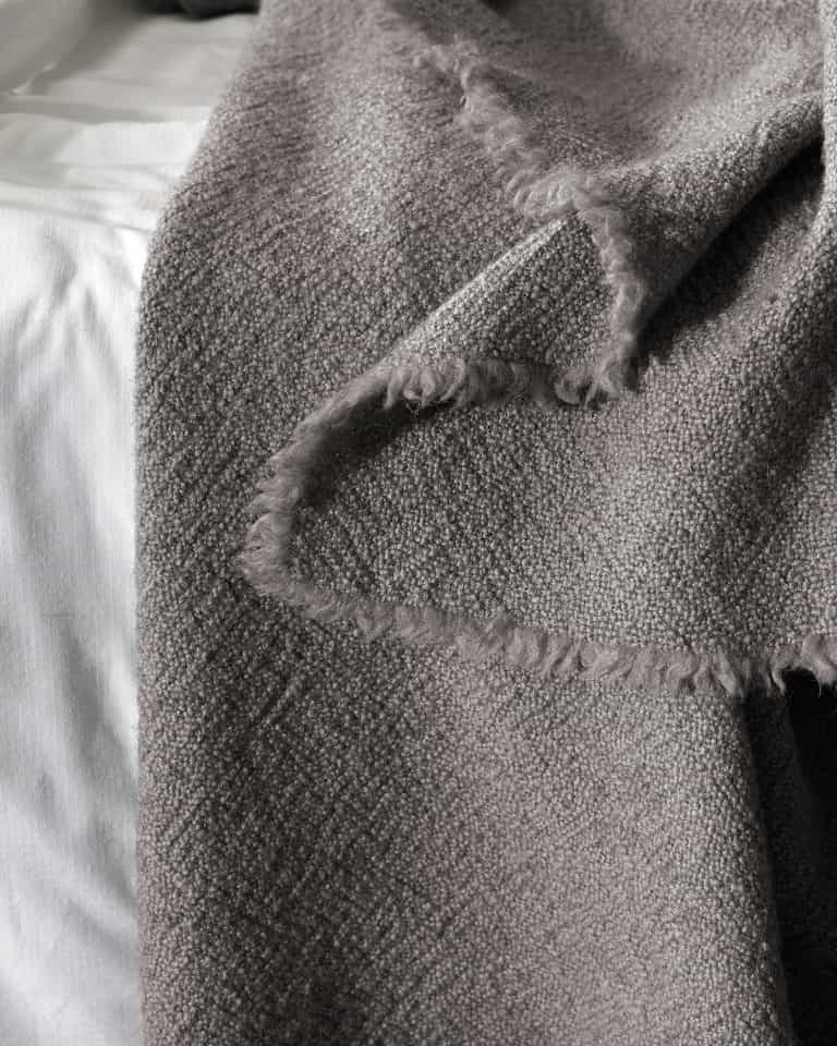 Des Blanket is a 100% blended wool blanket with frayed hems and a natural look. Although light and thin, it is rich, warm and smooth to the touch.