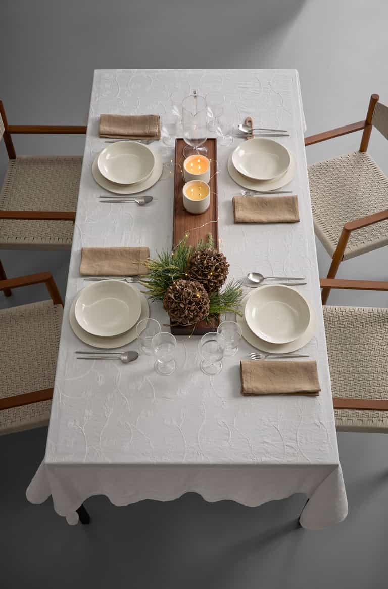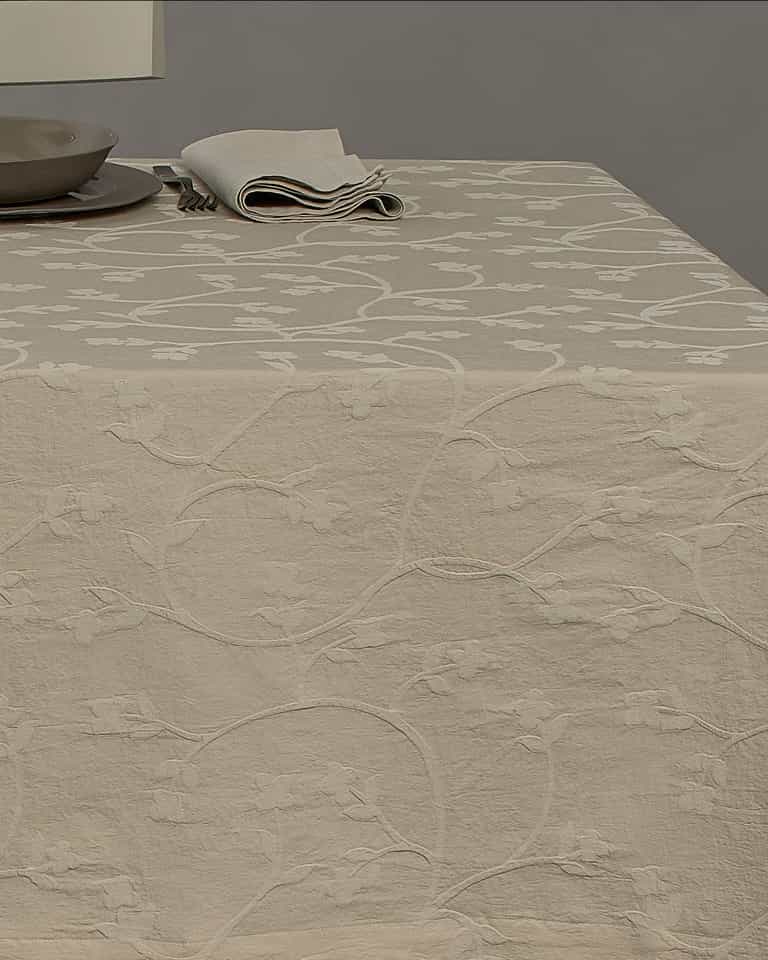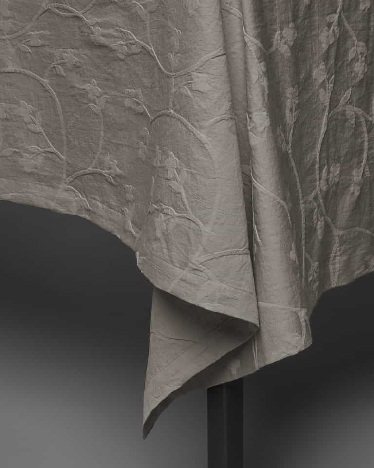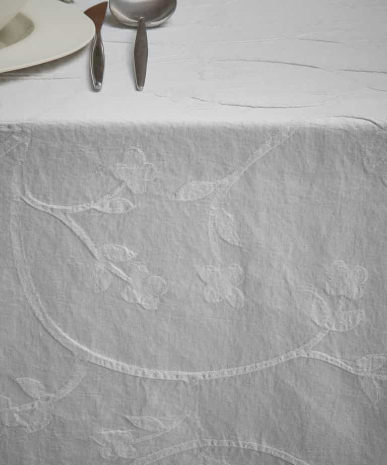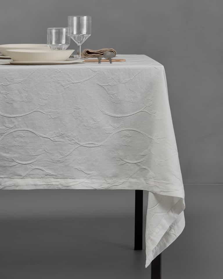 FLORIS tablecloth is the result of ongoing design and textile research. The blend of cotton and abaca fibers creates an embossed floral pattern with both shiny and matte areas. A satin background and a sinuous ornamental motif finish the look, making it suitable for both traditional and contemporary tables.