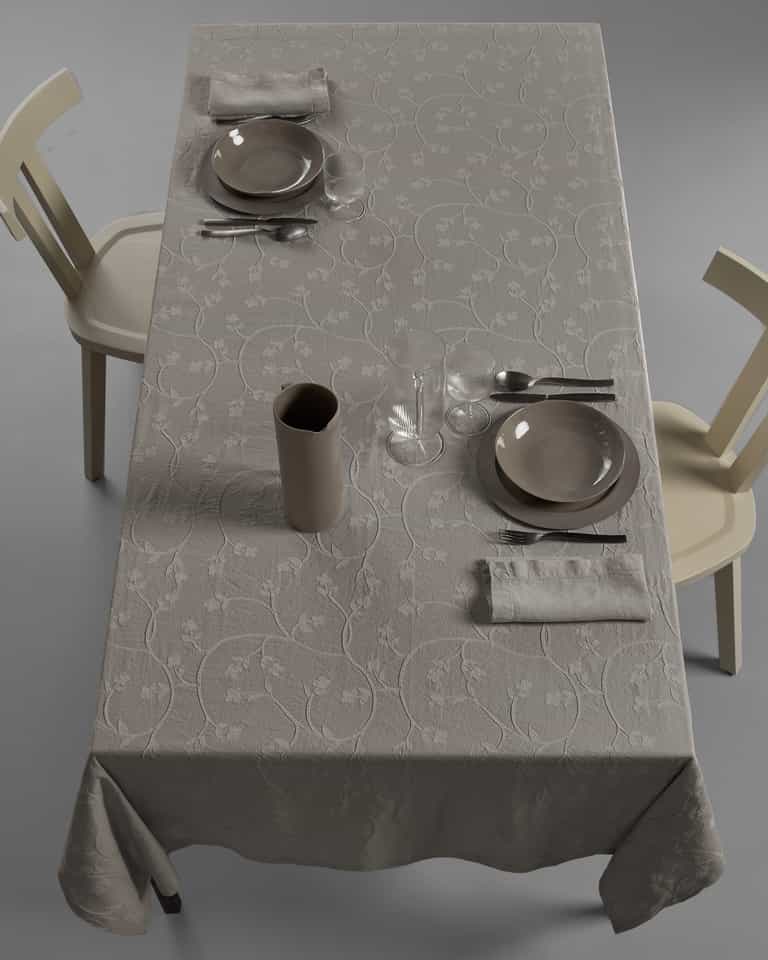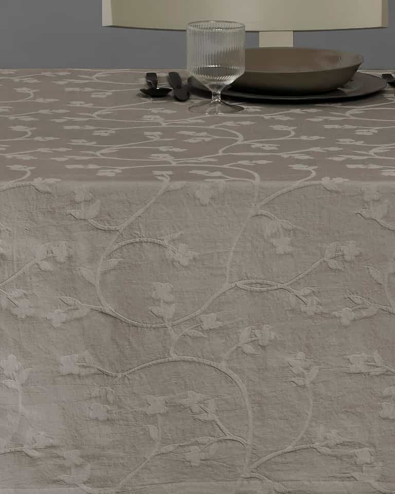 The Floris Tablecloth blends a 60% abaca and 40% cotton fabric to create an embossed floral pattern on a satin background, delivering a surface that pairs shine with softness. With a sinuous ornamental motif, it suits both traditional and contemporary dining spaces through thoughtful craftsmanship and versatile style.