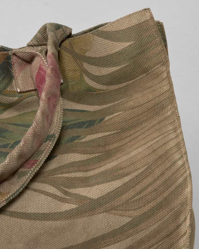 Frutta Hang is a cotton canvas bag reinterpreted through a spontaneous dyeing process. With the maltinto technique, colors are absorbed unevenly, creating color shades that are unique and unrepeatable. The macro print of a lush oriental flower is almost iridescent. The bag adds a vintage yet contemporary touch to outfits.