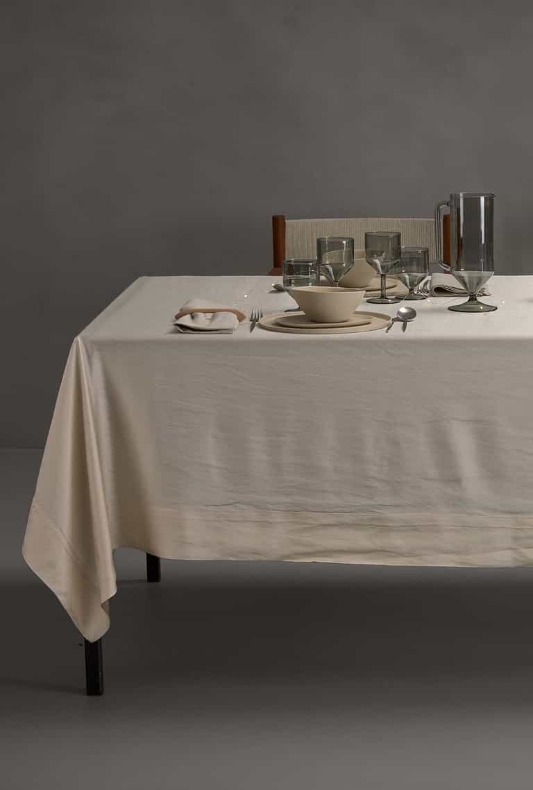 This tablecloth offers a refined balance of texture and color to elevate dining decor.