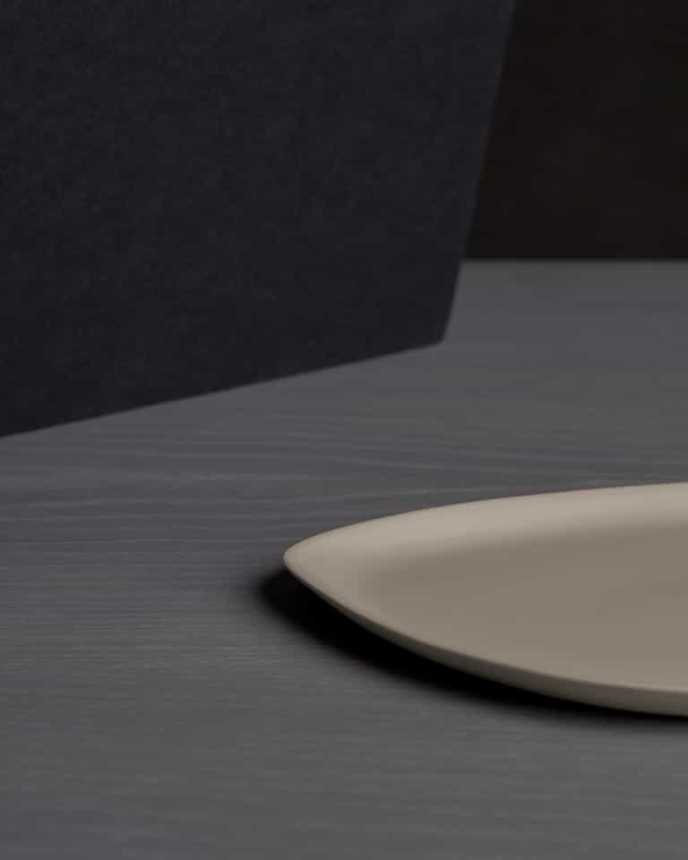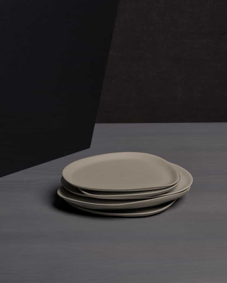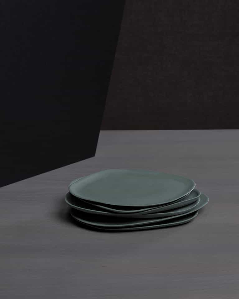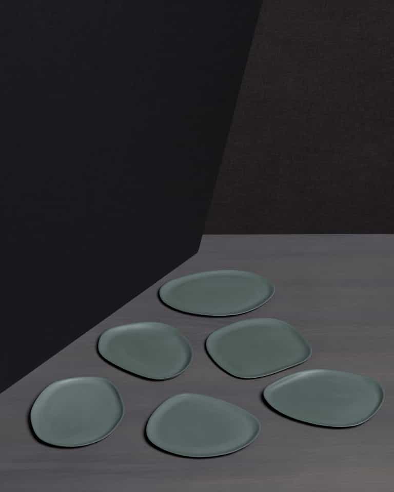 Guscio Side Dishes is a set of 6 dessert plates with a matte finish. Each plate has a different irregular shape, giving every piece a unique look.