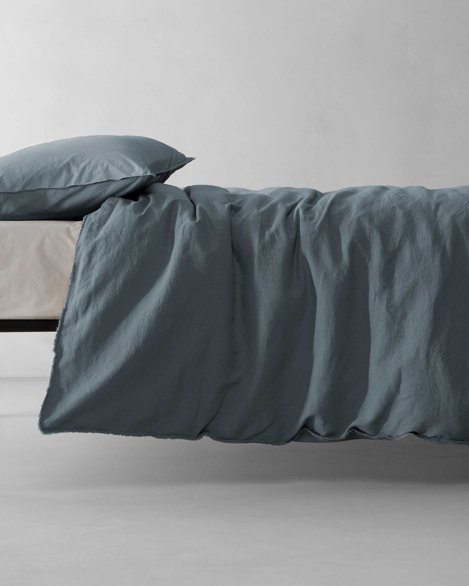 The Lico Duvet Cover, crafted from a luxurious linen and cotton blend, offers a gentle touch for restful nights and features elegantly frayed edges for a modern twist. Its delicate sheen and soft texture enhance comfort and style, while timeless colors allow for effortless matching in any sophisticated bedroom setting.