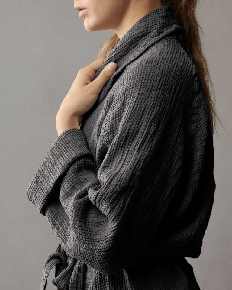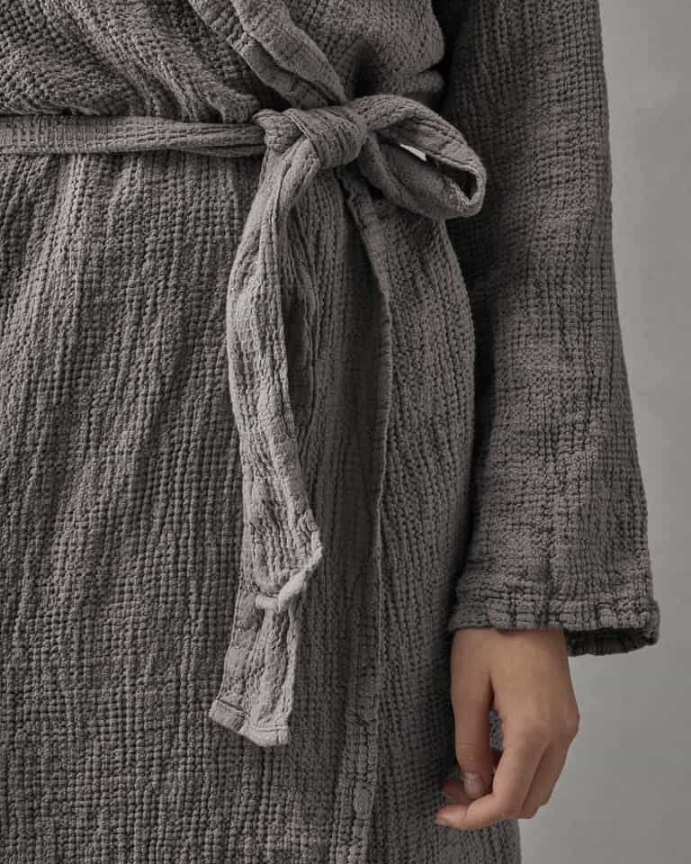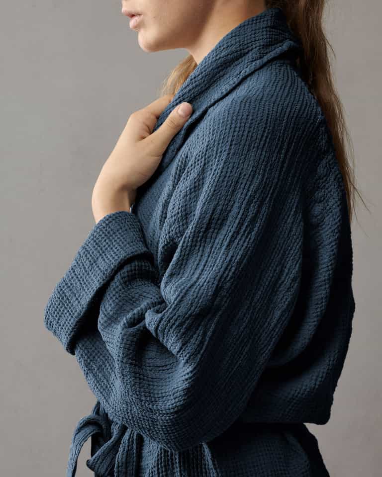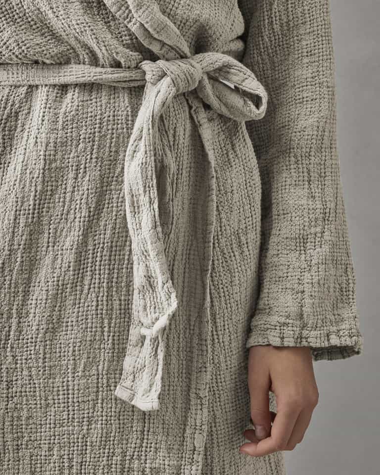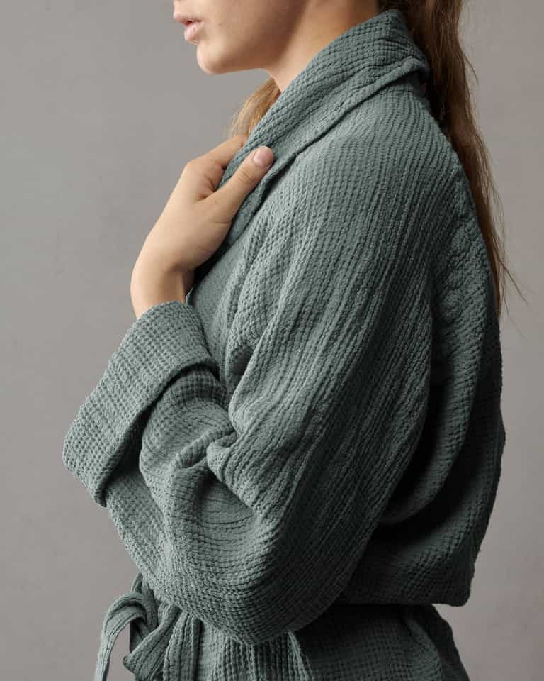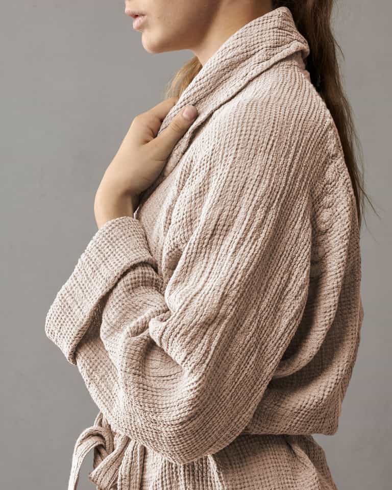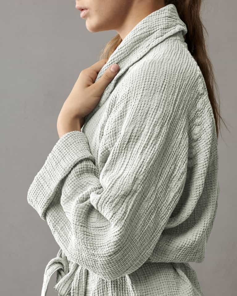 The Lipe New Robe is a lightweight, durable bathrobe with pure linen waffle weave for enhanced absorbency and quick drying, plus a practical shawl collar. Hypoallergenic linen fibers are gentle on skin, delivering comfortable wear for bath and lounging.