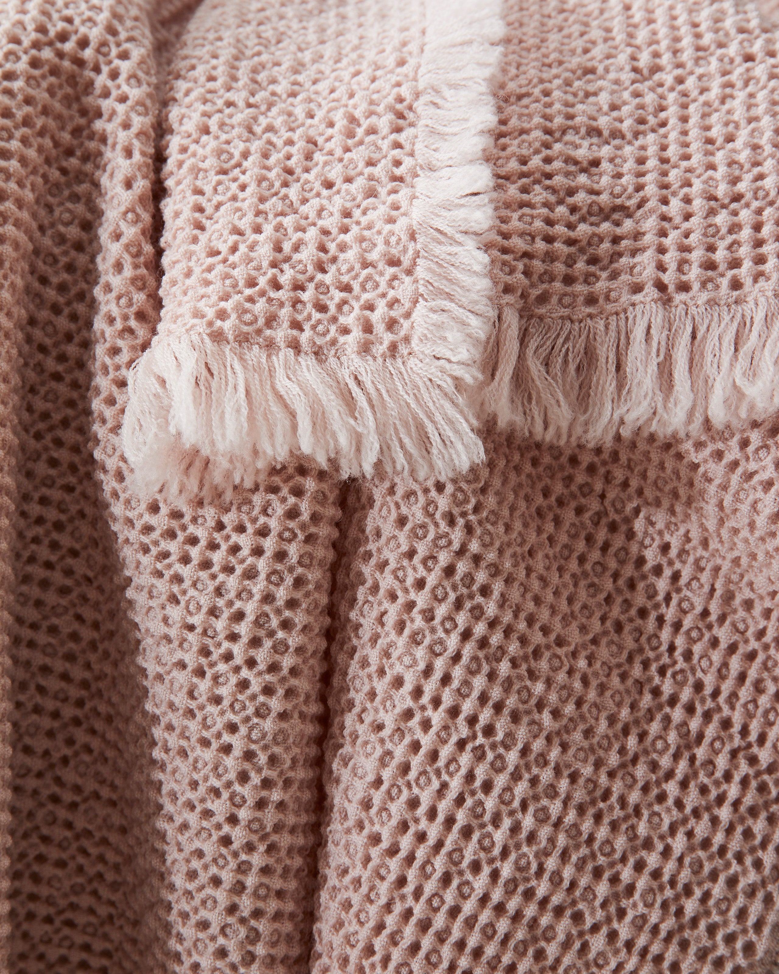 Nid Blanket uses 100% pure wool in a waffle weave for a warm, light touch and a three-dimensional texture. Garment-dyed color variations provide distinctive tones and a fluffier finish, with a weight of about 550 g/m² for a balanced drape.