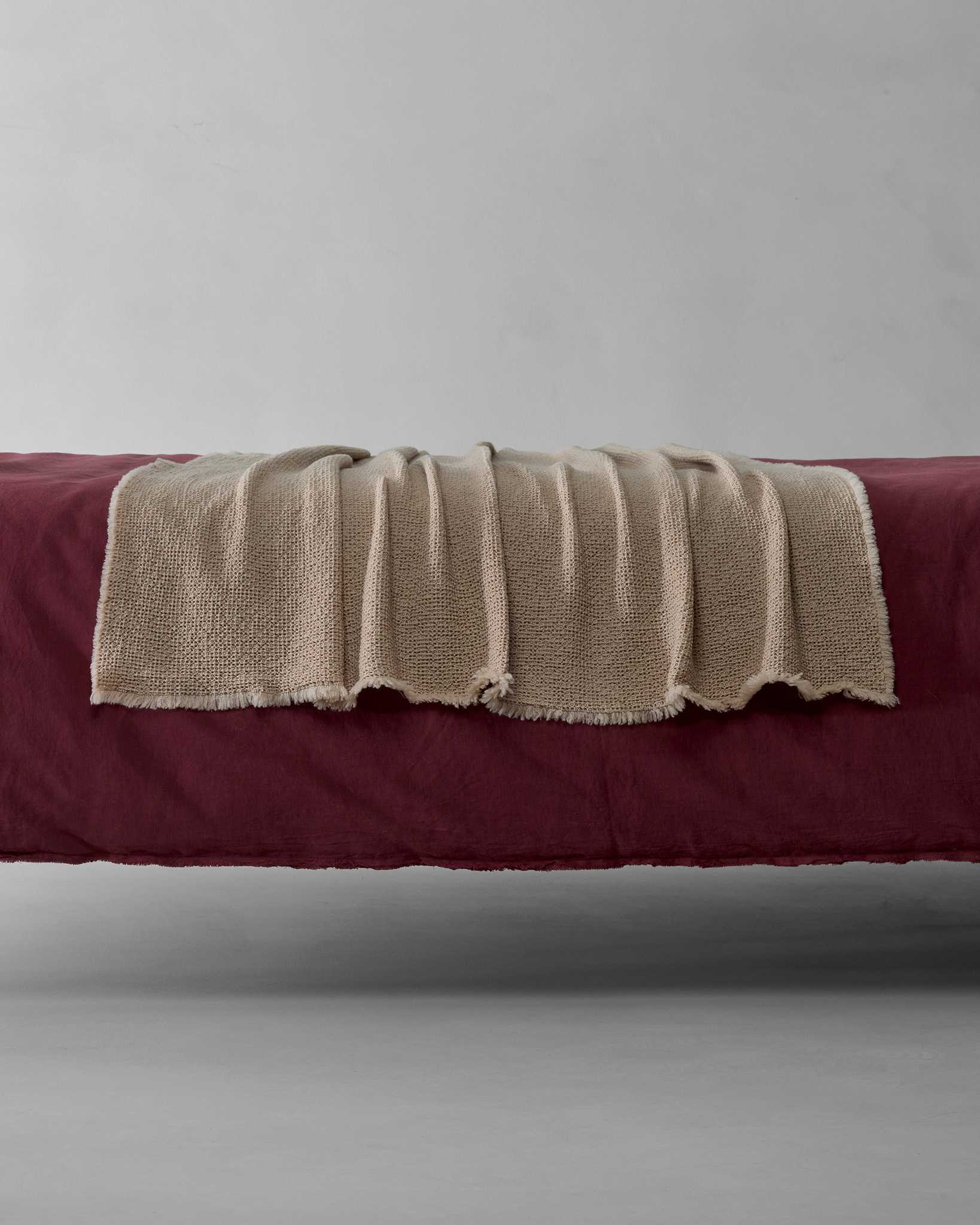 Nid Throw blends waffle weave with 100% Wool for a warm, elastic, and plush feel that adds texture to any room. Weighing about 430 g/m², this versatile throw stays light for mild winter nights and is ideal at the foot of the bed or for relaxing on the sofa.