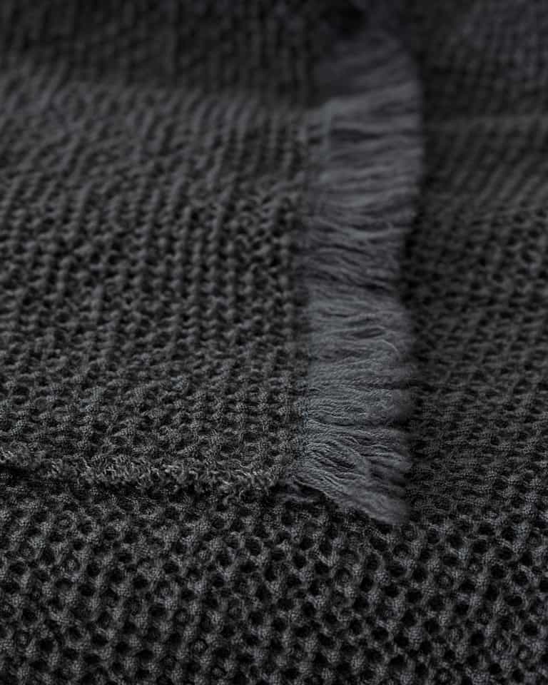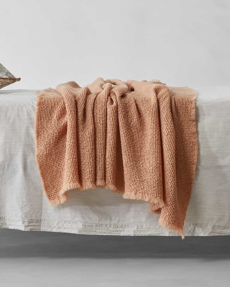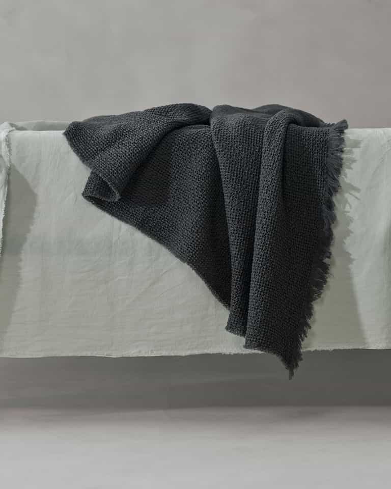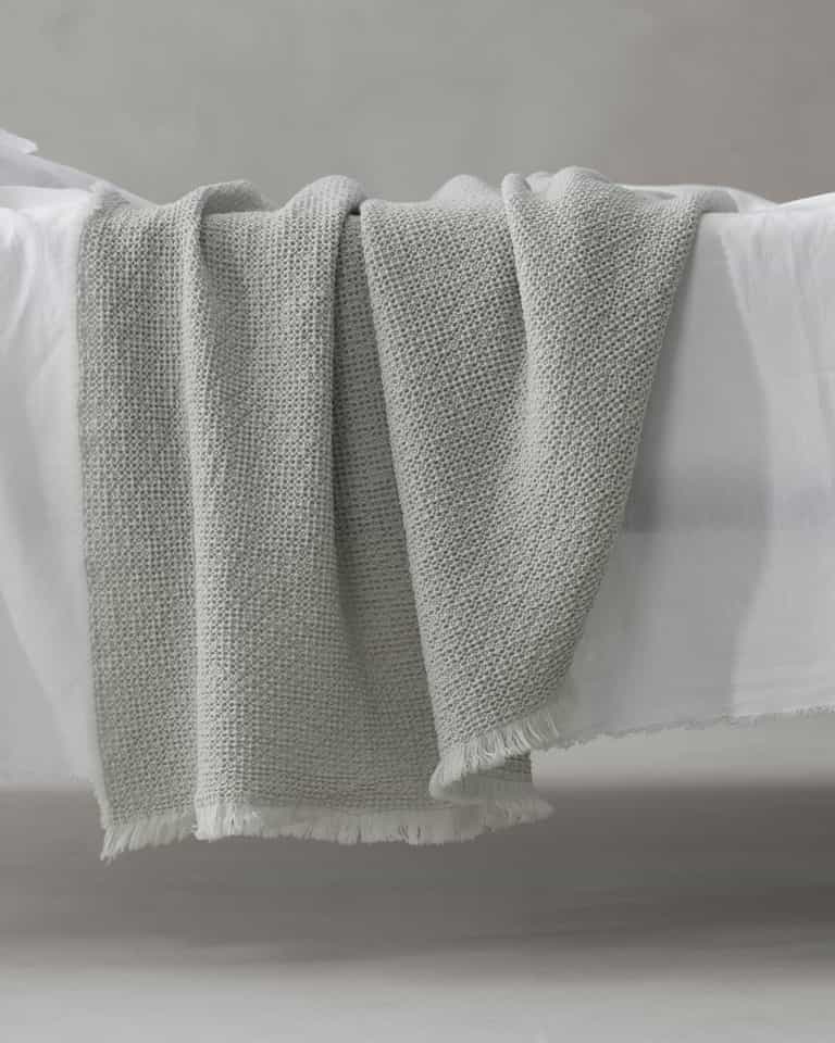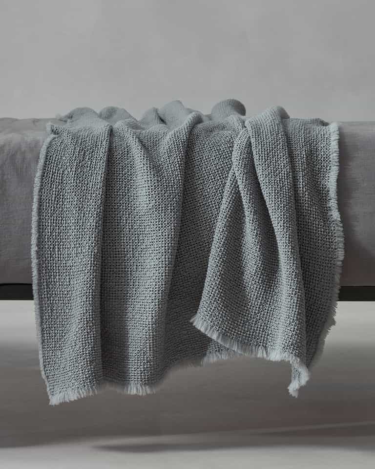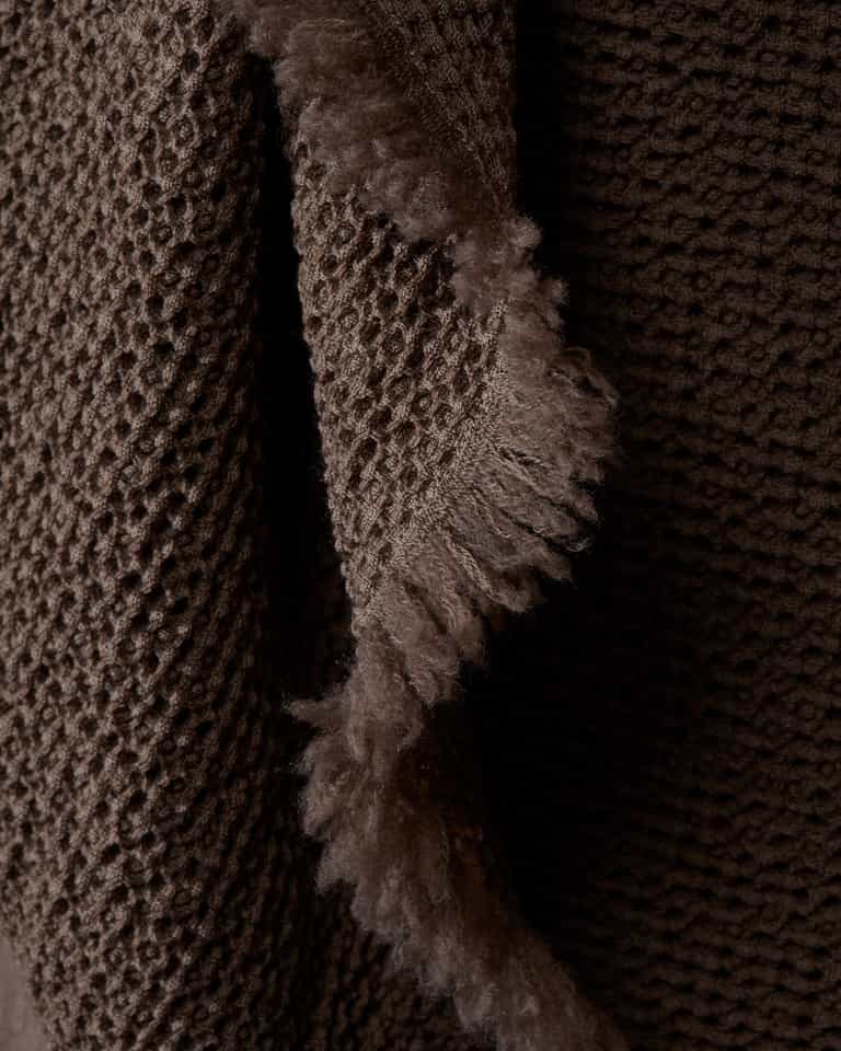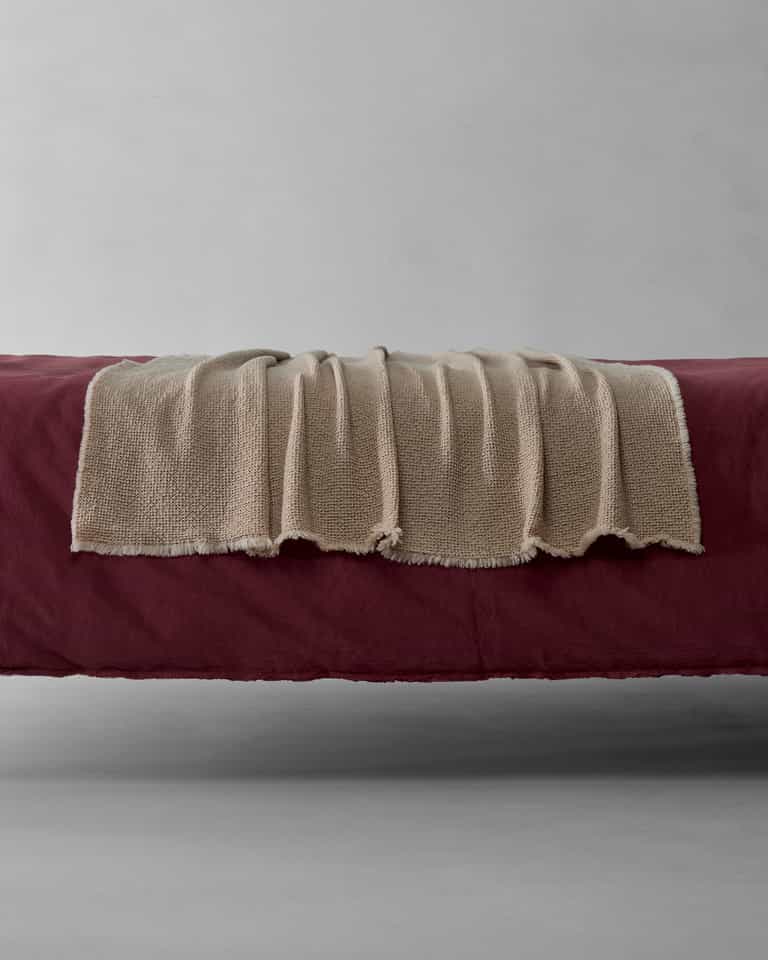 Nid Throw by Society Limonta blends 100% wool with a light waffle weave for natural warmth, a soft touch, and a light, textured feel. Designed for the foot of the bed or the sofa, it stays warm and elastic with generous loft and a weight of about 430 g/m².