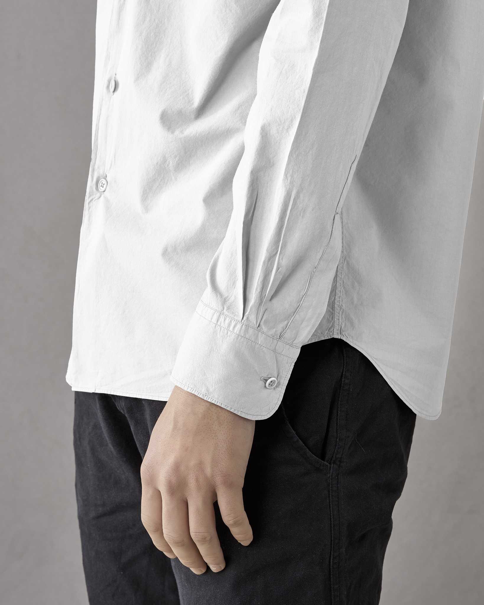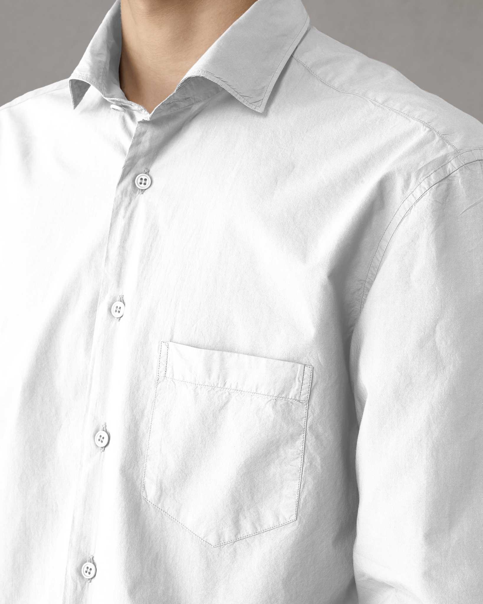 The shirt is fresh and light, with a left chest pocket, a semi-buttoned collar and button cuffs—a practical, informal piece for everyday wear.